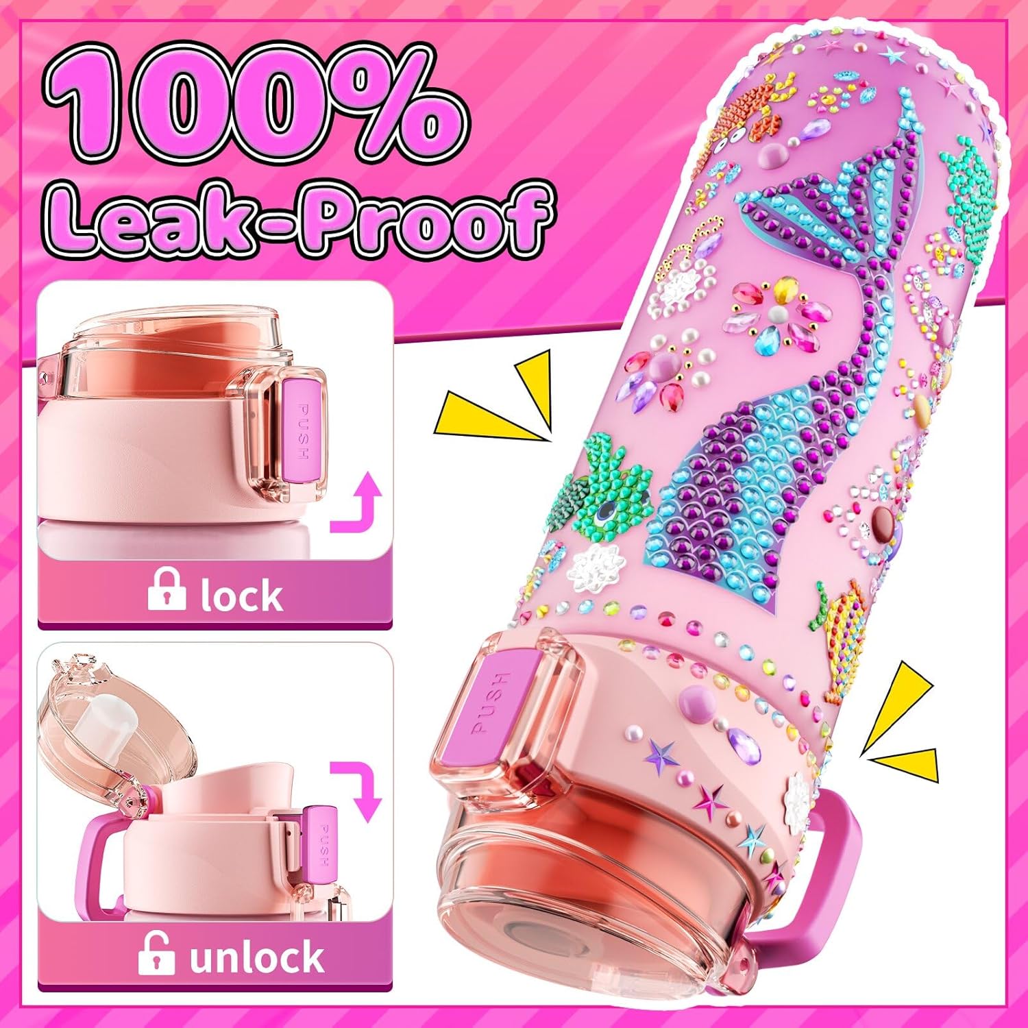 Easily Open & Leakproof: Our DIY mermaid water bottle flip-top lid is designed with a secure lock, which effectively preventing dust. The wide mouth is easy to clean and add fruit or ice cubes! The school water bottle features a food-grade silicone ring inside, provides 360° leak-proof protection. The diamond decorations water bottle with time marker can motivate kids stay hydrated all day