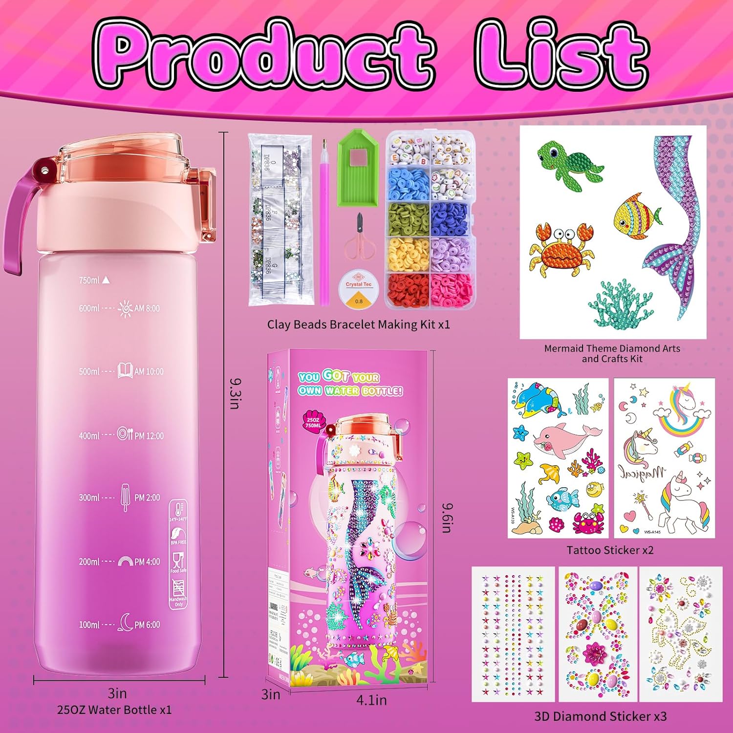 Fun Arts And Crafts For Kids: Our DIY Mermaid Painting Crafts includes: 25OZ Water Bottle x1, Tattoo Sticker x2, 3D Diamond Sticker x3, Clay Beads Bracelet Making Kit x1, Mermaid Theme Diamond Arts and Crafts Kit x1. DIY water bottles show unique creativity, convey emotions, cultivate manual skills, and bring pleasure and relaxation. Suitable for 6+ year old girls