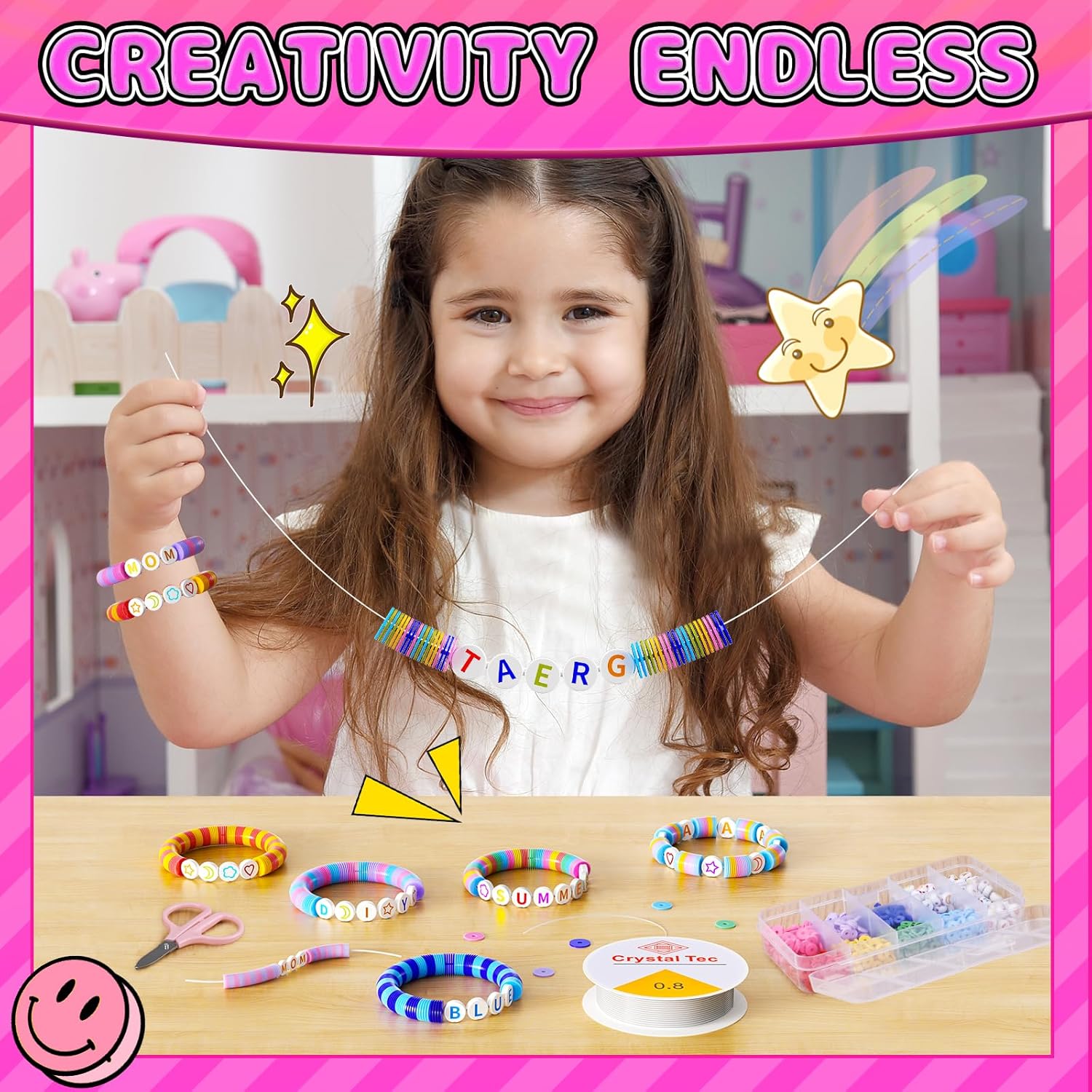DIY Bracelet Making Kit: All of our beads are made of healthy and environmentally friendly materials, light and durable, comfortable to the touch. including more than 1200 pcs flat polymer clay beads and 140 pcs charms kit, equipped with roll stretchy strings and scissors. Recommended age 4+ years old. This is great for kids, they can learn new things, create fun creations, and spend time creating which is much more meaningful than playing on your phone
