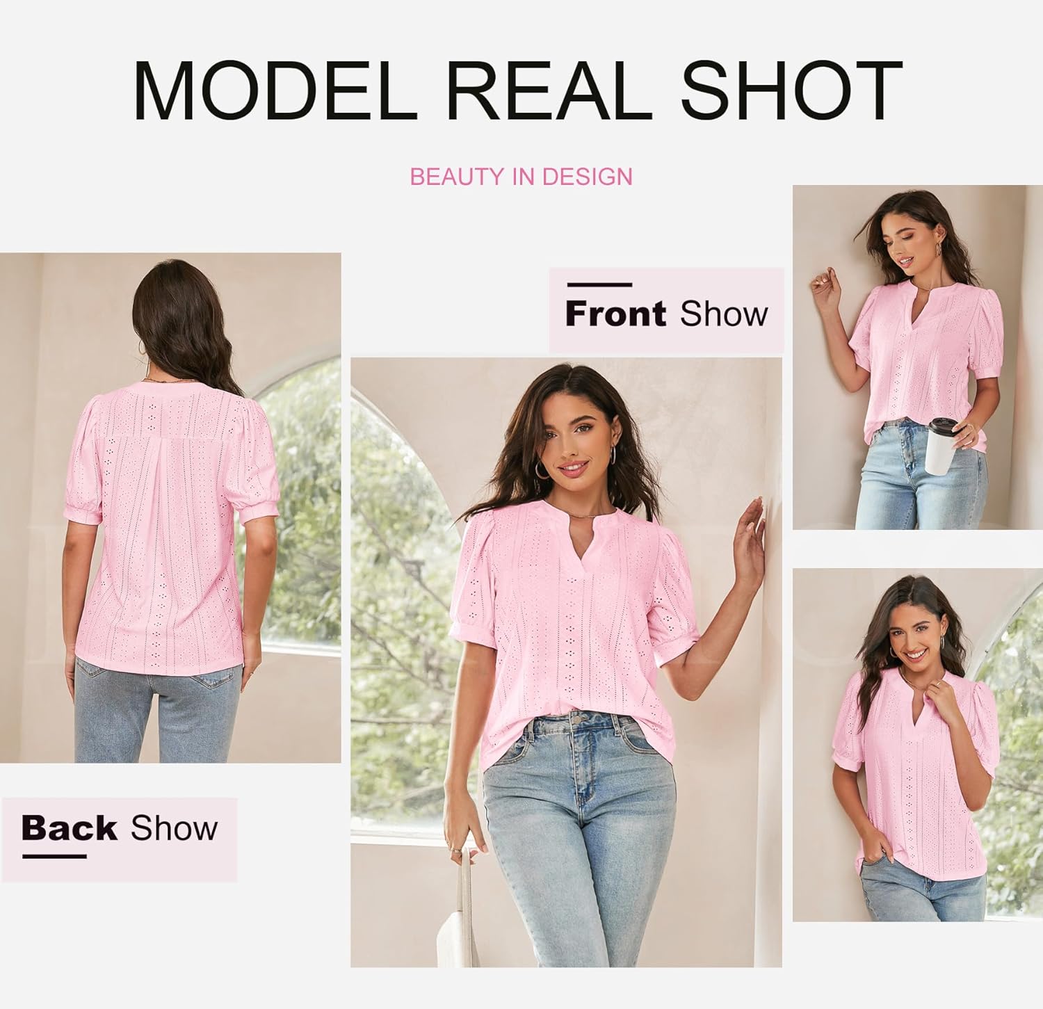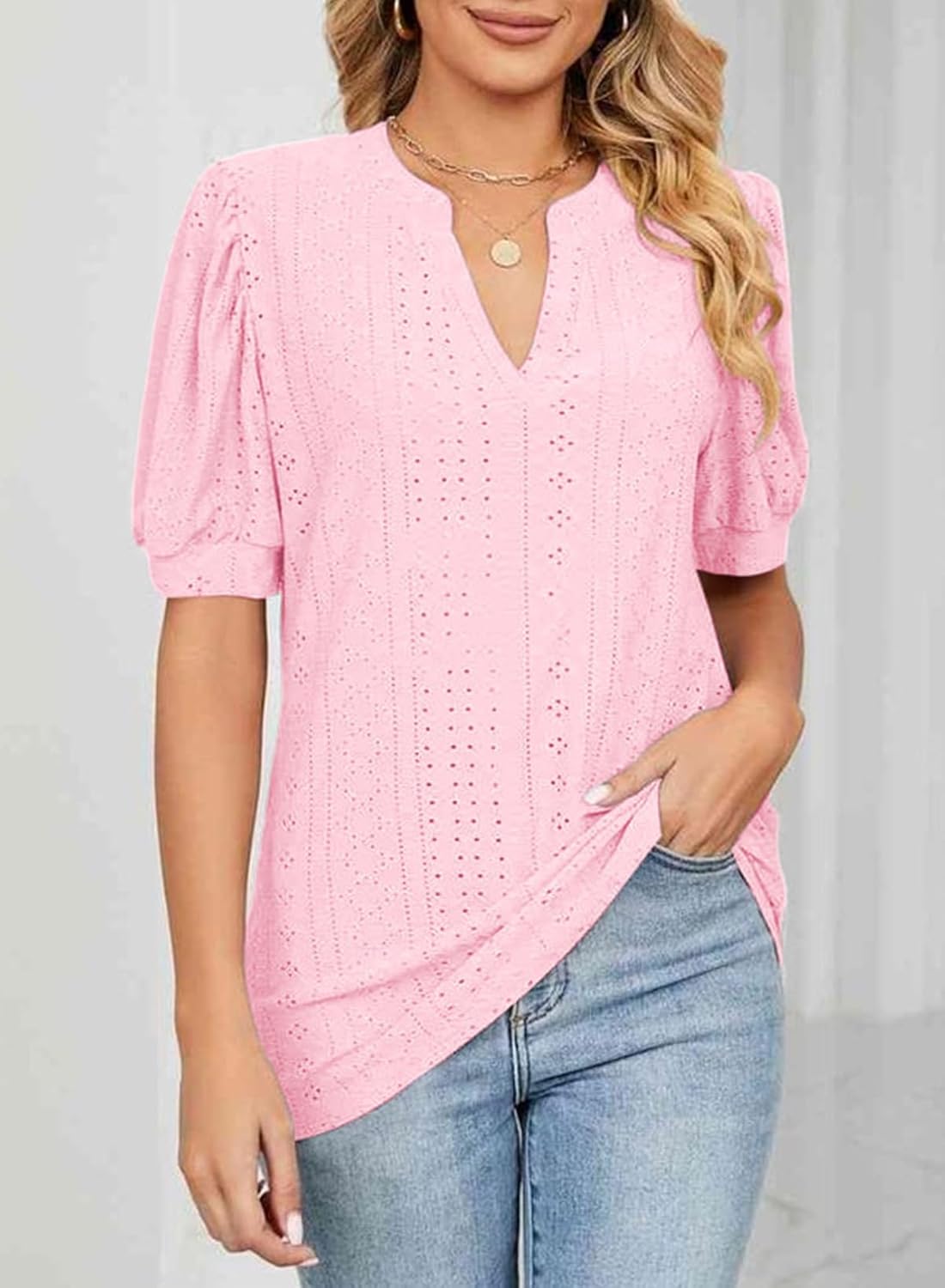 Design: As a standout among women's shirts, this piece features a V-neck, short bubble sleeves, and a solid color, making it a versatile and fashionable choice for any woman's wardrobe.