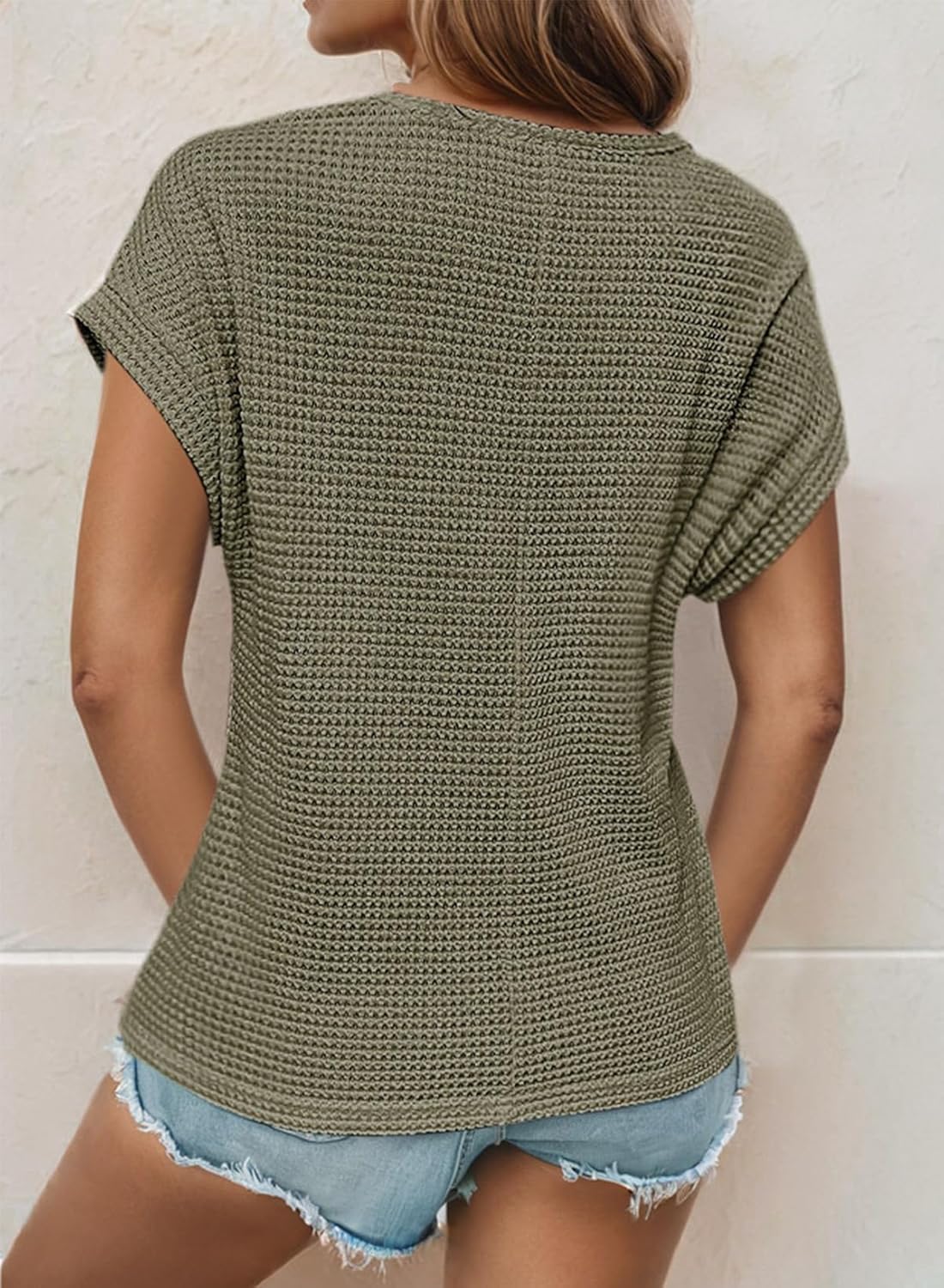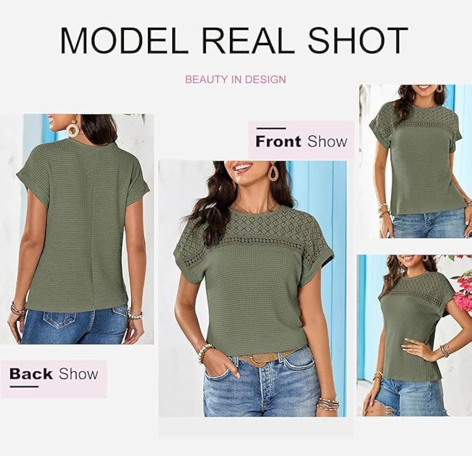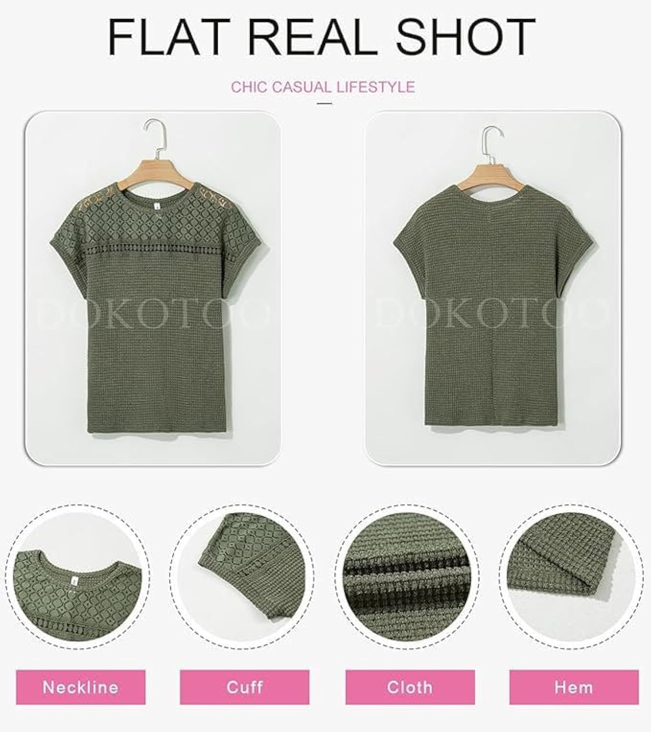 Feature: Short Sleeve Tops for Women, Solid Color, Crochet T-Shirts, Women Waffle Knit T Shirts, Crew Neck, Crochet Top, Lightweight Knit Shirts for Women, Unique Knitting Pattern, Loose Fit Pullover Top, Relaxed Fit.