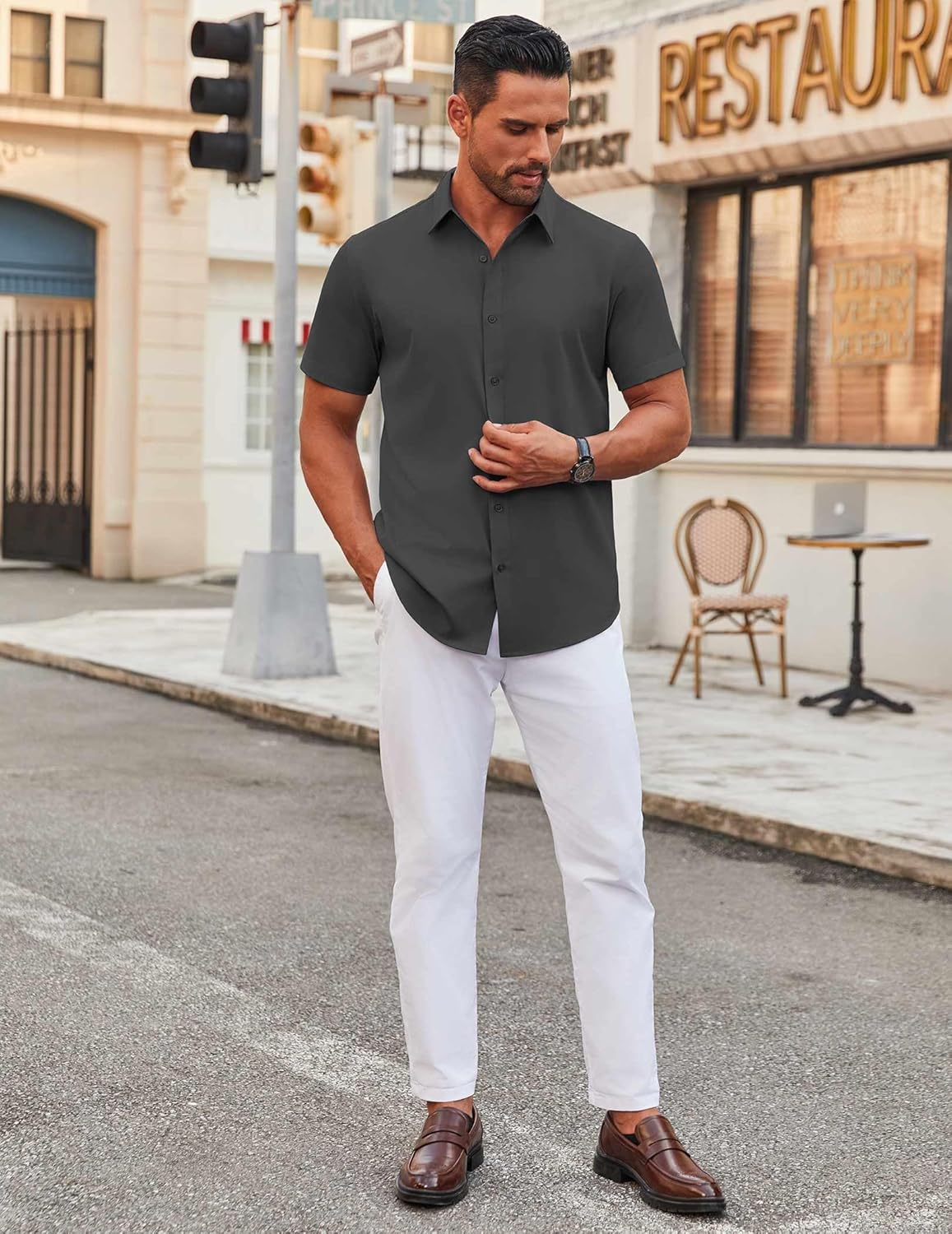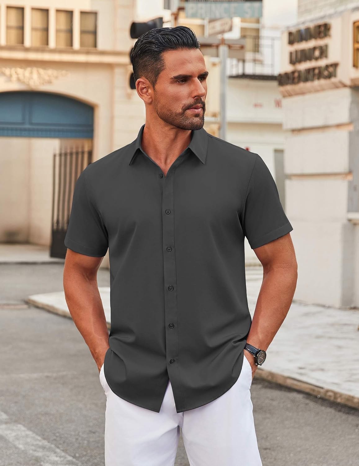 Suitable Occasions - Perfect for casual, business, office, work, date, wedding, concert, party, club, school, vacation, travel, home, etc. Its elegant design and comfortable fabric make this short sleeve button up shirt suitable for both formal and informal settings.