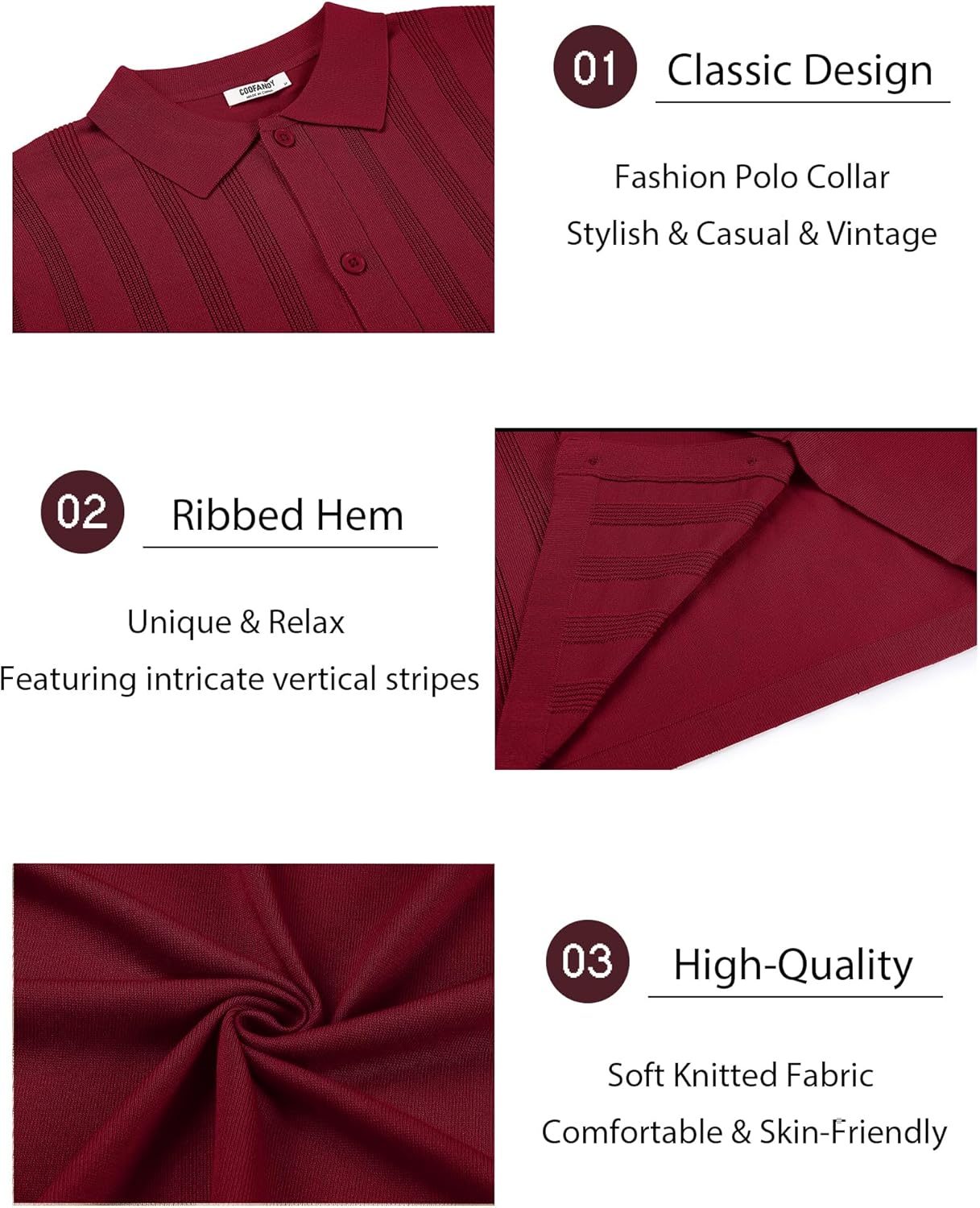 Distinctive Design: Featuring intricate vertical stripes, this knit polo shirts enhances visual depth and style sophistication. The front button design ensures easy wearability, adding a touch of casual elegance, while the classic turn-down collar bridges timeless tradition with modern sensibilities.