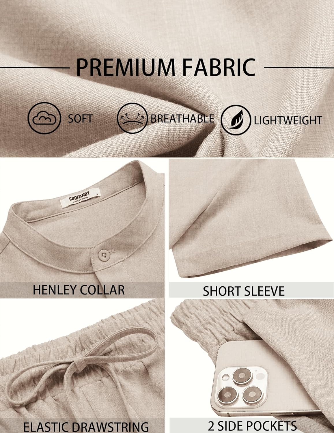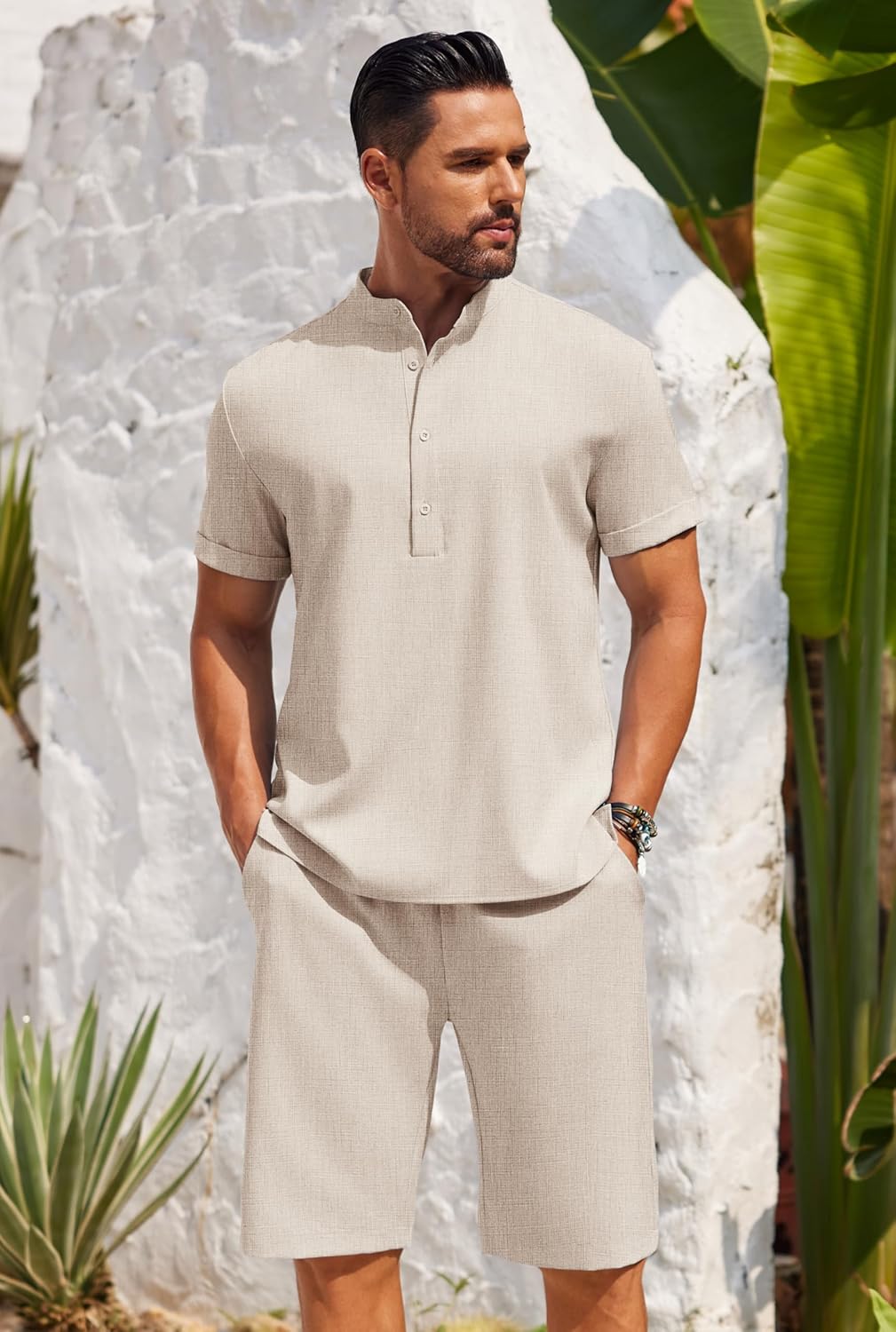 【SUMMER BEACH SHIRT】Men's 2 piece set outfifs featuring with henley collar, button closure, texture linen, short sleeves and rolled cuffs. The vacation suit for men features elastic drawstring waist, providing enough waist and leg room to move more freely.