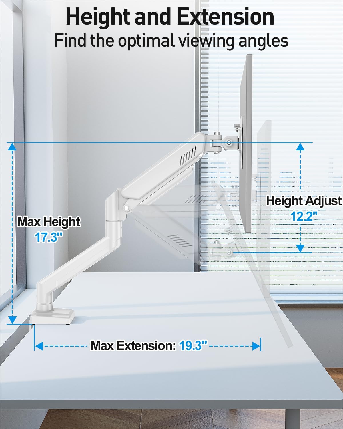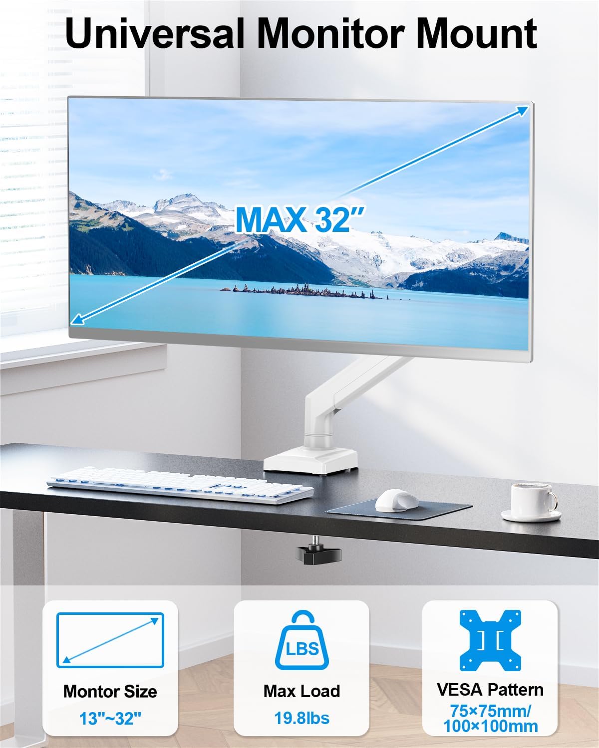 Universal Compatibility: The gas spring monitor arm provides upgraded loading capacity and can securely and easily hold monitors 13,19,21.5,22,23,24,27,32 inches and supports 4.4-19.8lbs monitors. Compatible with VESA 75x75mm and 100x100mm.