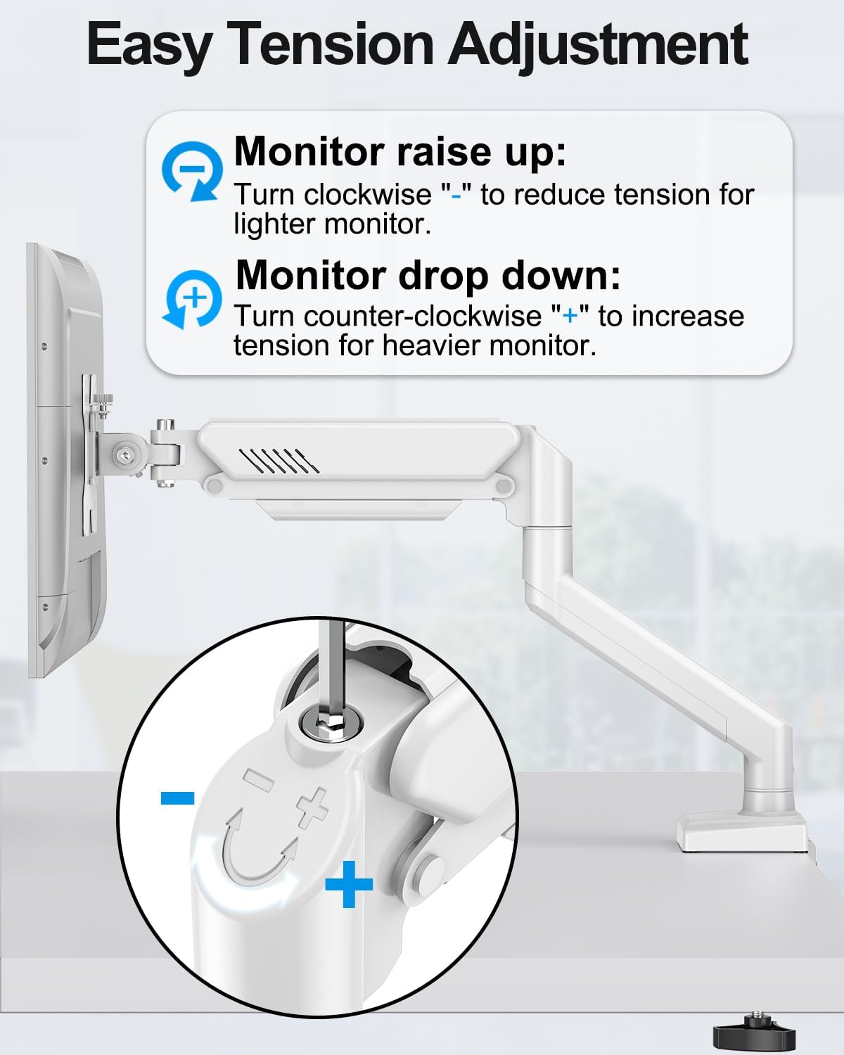 Effortless and Flexible Installation : Our desk monitor mount is quick and easy to install with the included hardware and instruction manual. Simply attach it to the edge of your desk and adjust to your desired position in minutes