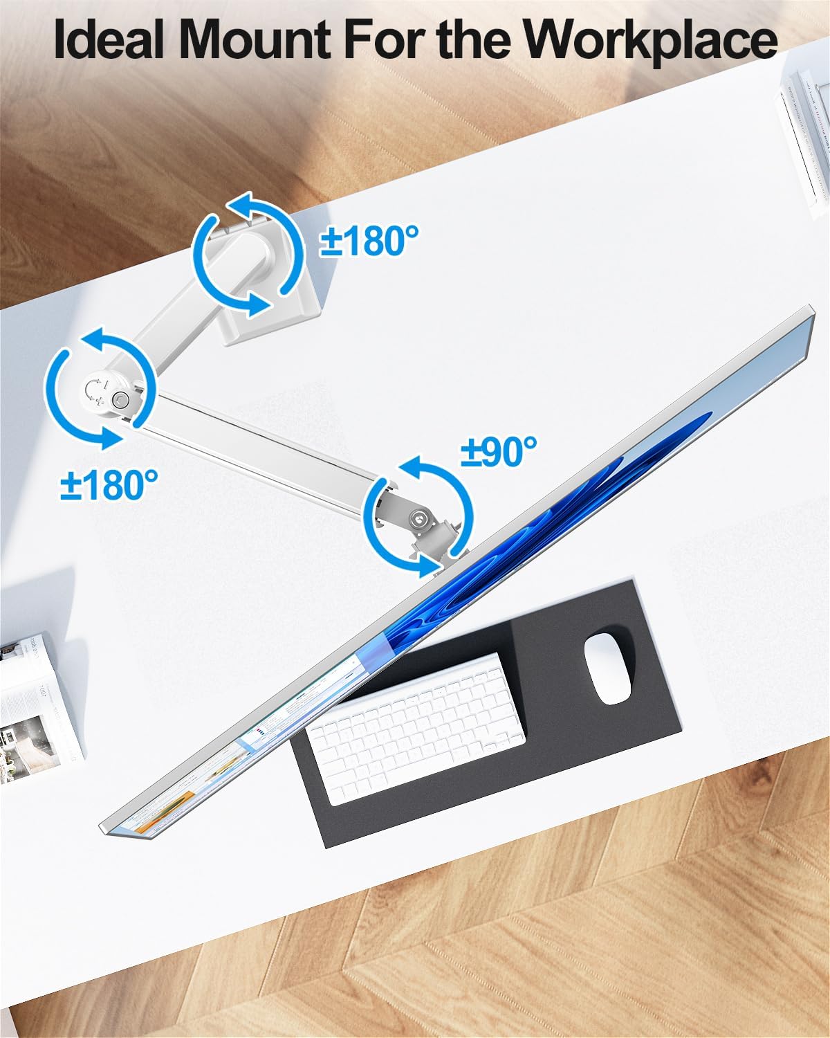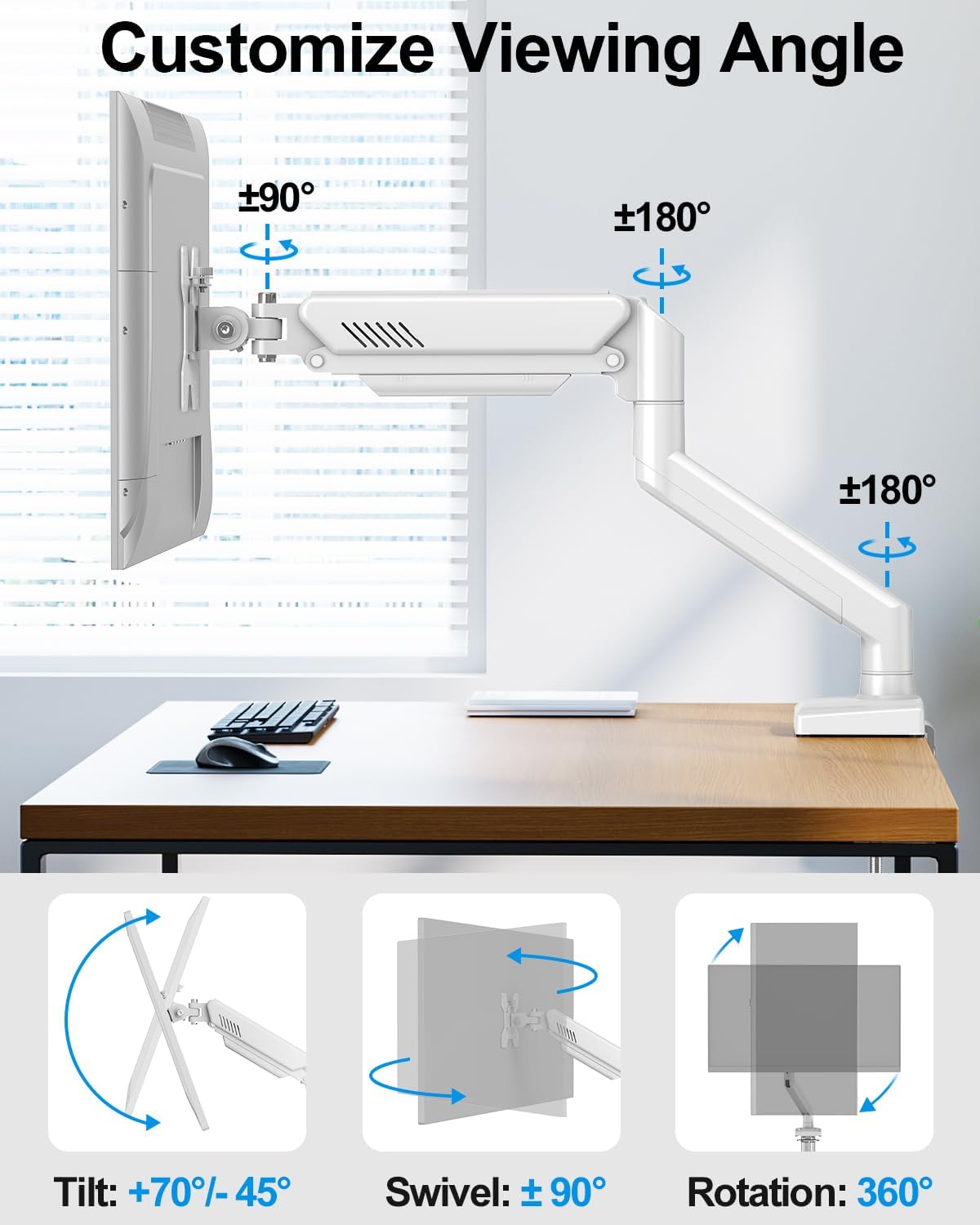 Flexible Adjustment: Freelift full motion single monitor desk mount allows you to adjust your monitor to the perfect height and distance, 180° swivel, tilt +70° to -45°, 360°rotation, increasing your productivity