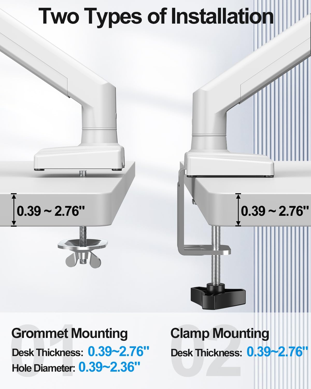 Excellent Quality and Design: Our computer monitor mount has been rigorously tested to ensure durability and longevity, with over 20,000-cycle test to prove it. The single monitor arm with two mount options, C-clamp mount and grommet mount for desk thicknesses from 0.39" to 2.76", hole diameter within 0.39"-2.36"