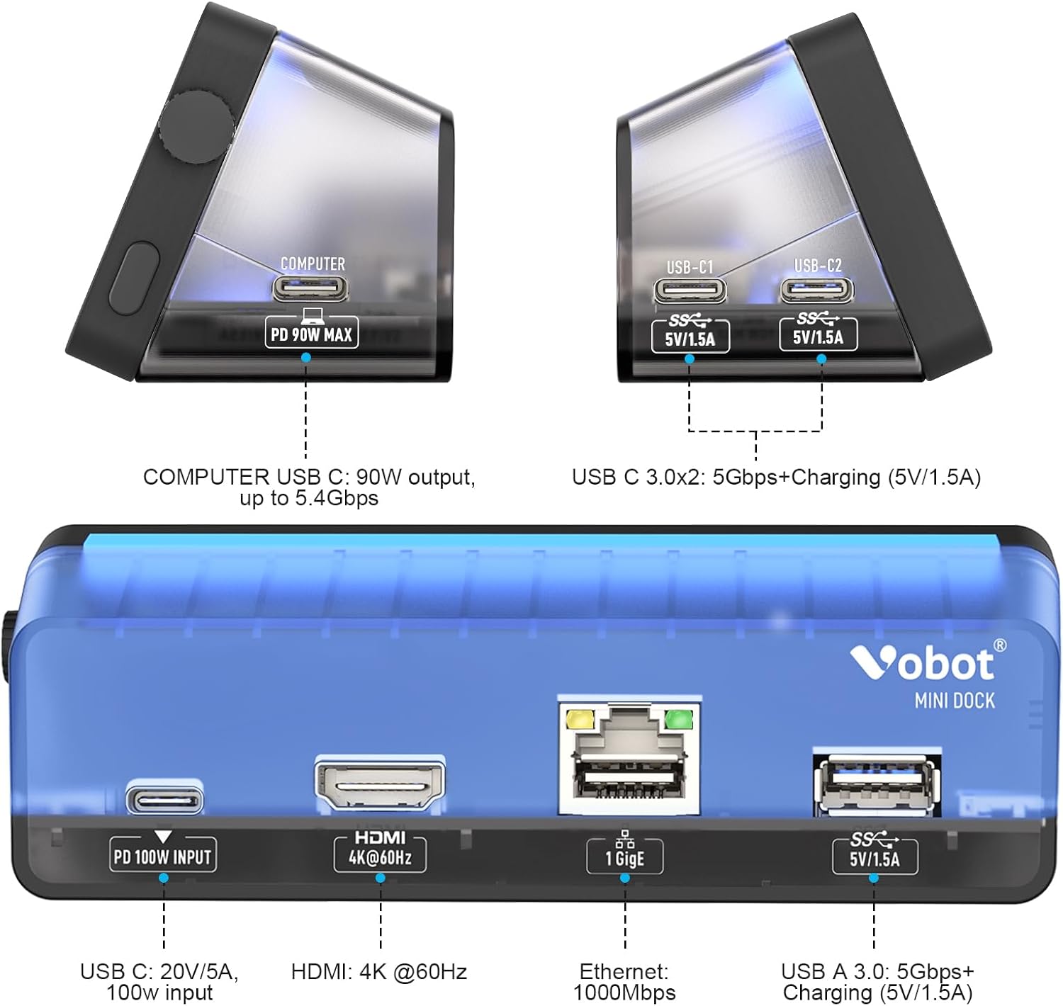 USBC Docking Station: This innovative Mini Dock macbook docking station comes with a 4K@60Hz HDMI port, 90W Max PD charging port, 1 Gbps Ethernet, 3 USB 3.0 ports (up to 5 Gbps), plug and play, uses only one USB-C cable,and everything is set up