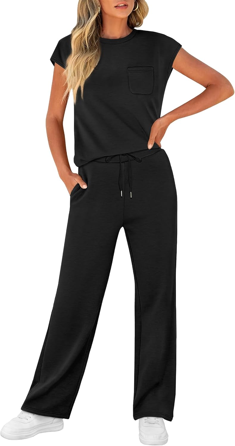 WIHOLL 2 Piece Sets for Women Casual Summer Travel Vacation Outfits Cap Sleeve Lounge Set