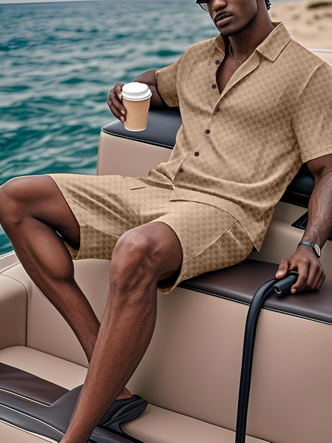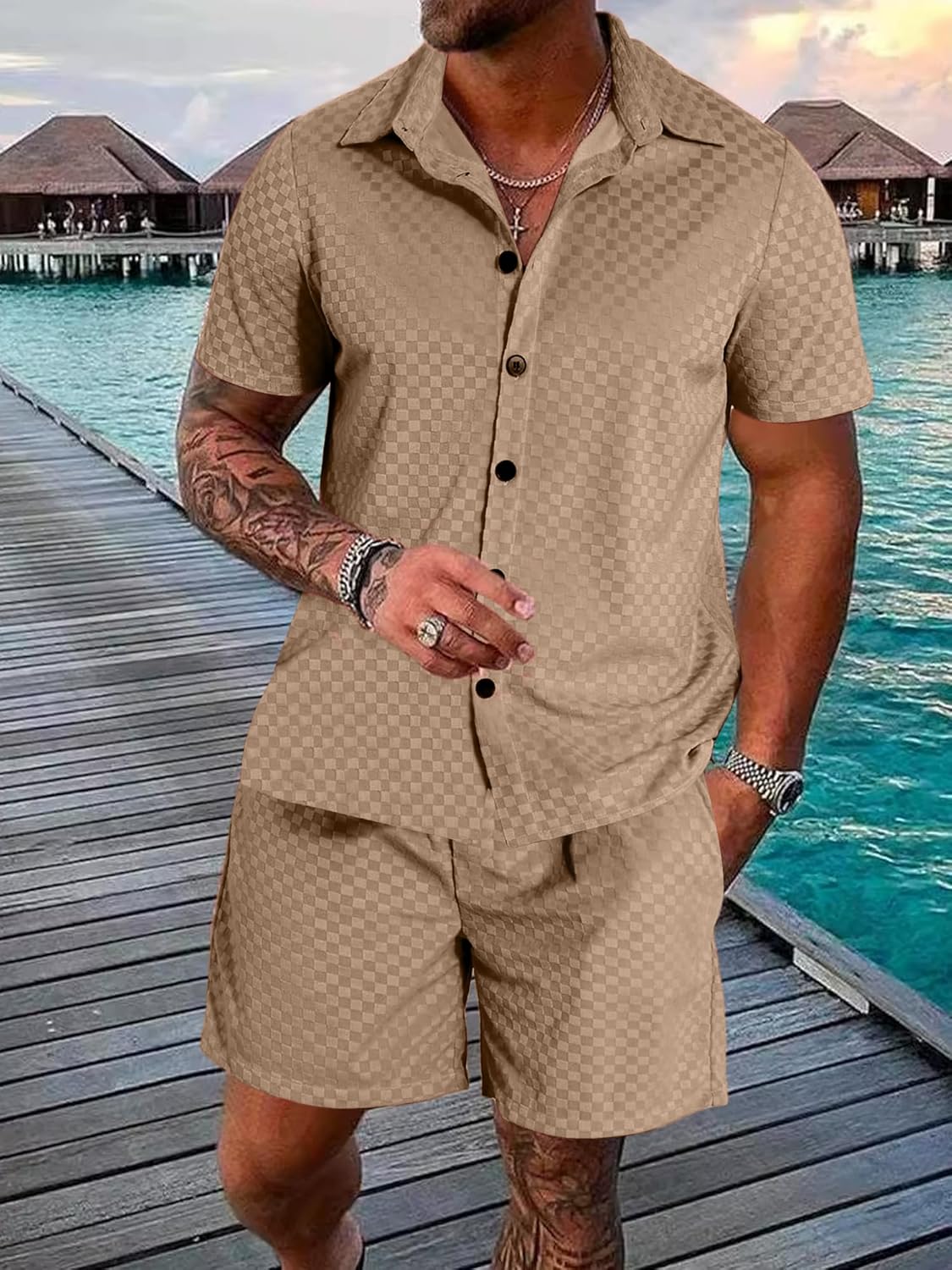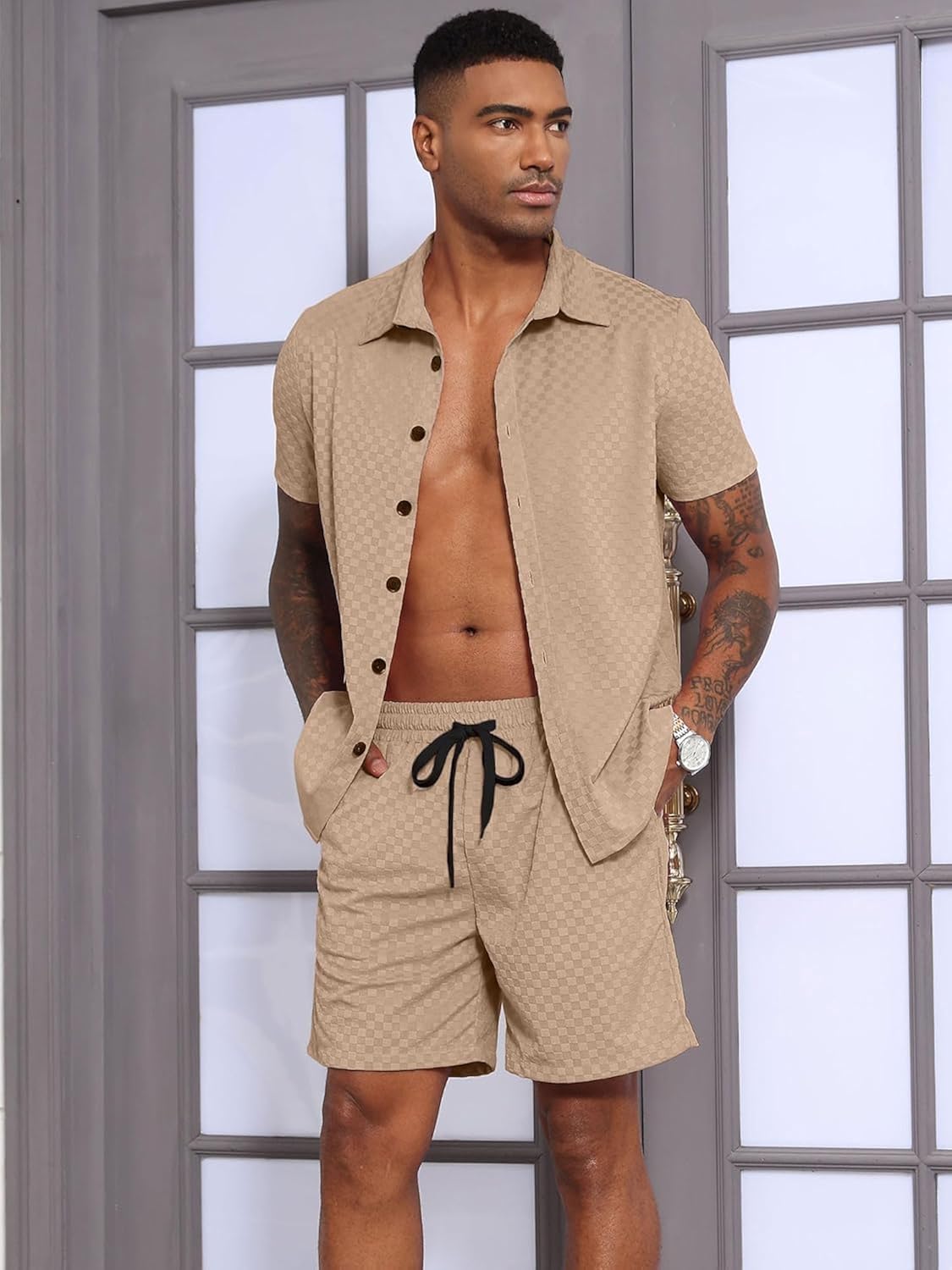 Design: Mens beach vacation outfit, checkerboard pattern, velvet fabrics, short sleeve, button front, adjustable drawstring, casual shorts, side pockets. This 2 piece set for men is a must-have for your wardrobe.
