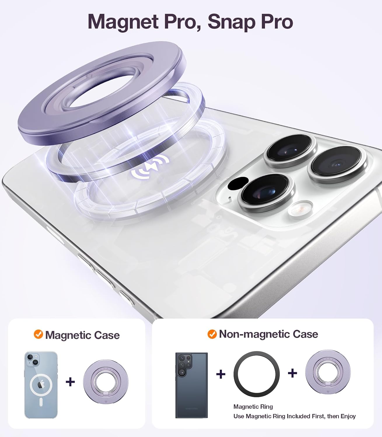Designed for All Phones: This magnetic grip holder can snap directly to the magnetic case for iPhone 11, 12, 13/14/15/16Pro/16ProMax, Plus, Mini, XR, SE or (MagSafe magnetic cases) for your Samsung S21, S22, Galaxy S23, S24 Series, google pixel or other android phone. Note: If using Non-Magnetic Regular iphone cases, you have to use metal ring included first (stick to your case), then enjoy the magsafe stand/ grip holder