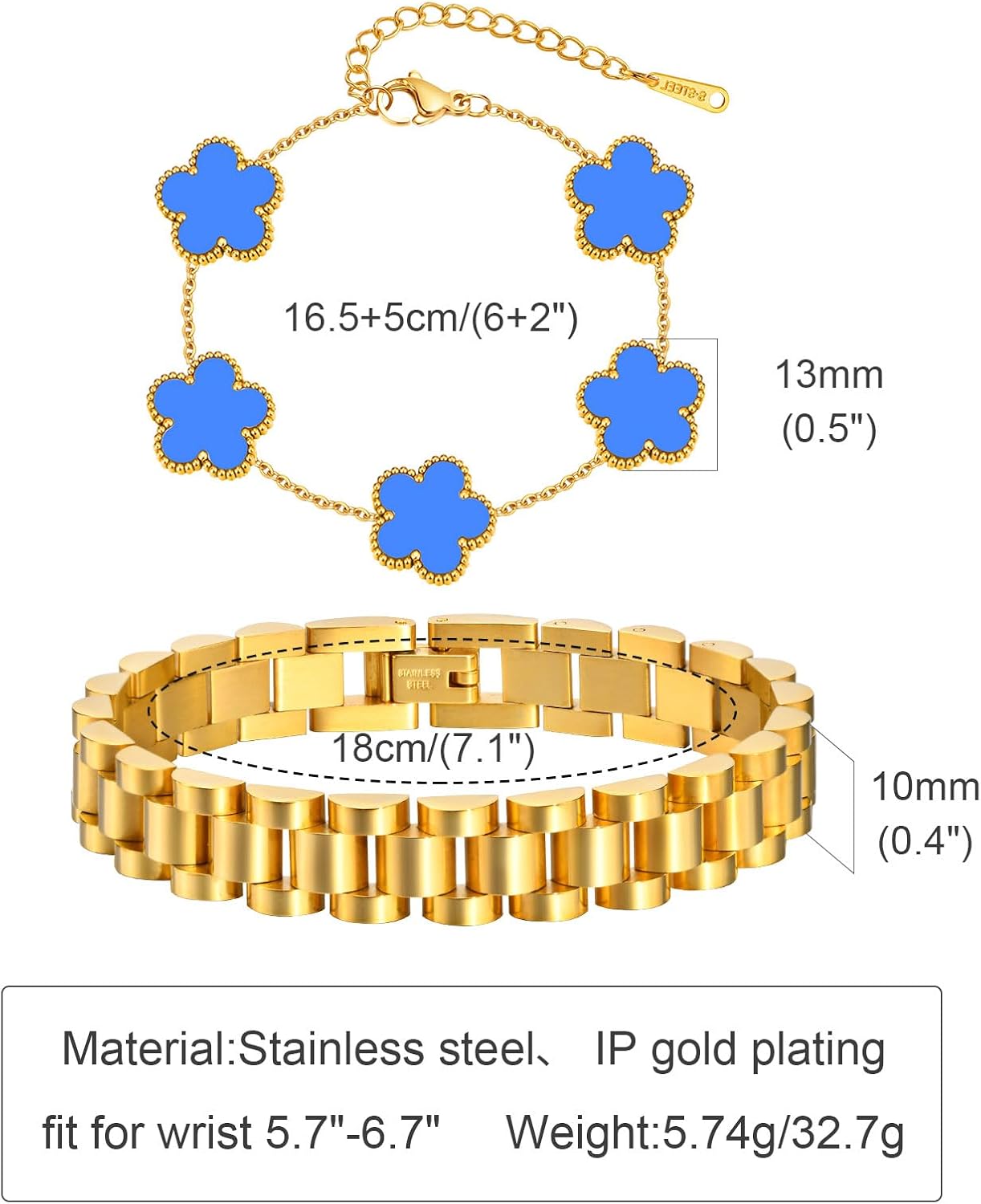 Women Gold Bracelet Jewelry Size: The circumference of this link bracelet is 18 cm (7.08 inches), the width is 10 mm with adjust tool, the flower chain bracelet length is 16+5cm(6.3+1.96"), suitable for most wrist sizes from 5.7" to 7".