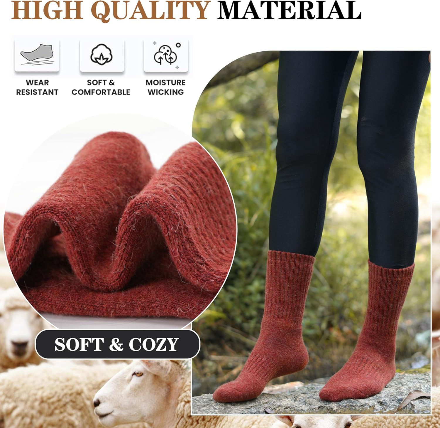 HIGH QUALITY : The womens wool socks for hiking are blend of premium natural wool and cotton. These winter hiking socks for women are heavy, soft, comfortable, breathable, warm, cozy and durable.