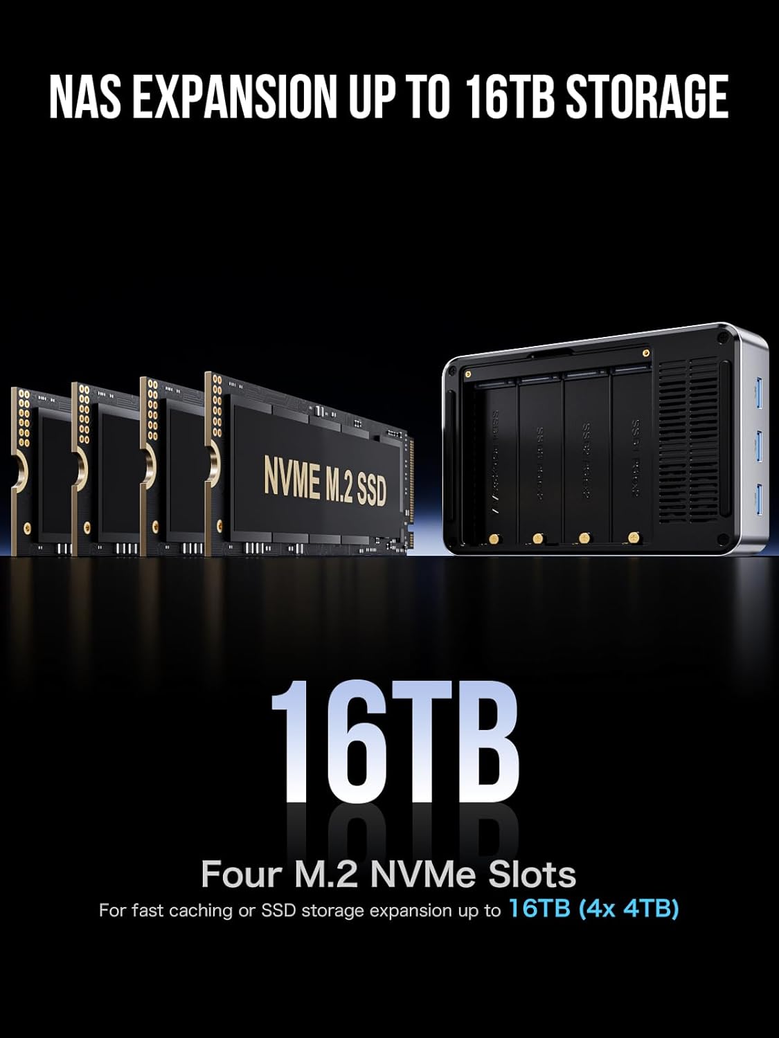 MINI PC NAS HYBRID COMPUTER - The G9 mini pc is one of the first computers to incorporate 4x M.2 2280 PCIE slots so you are able to use NAS software with normal PC features. The G9 uses the latest Twin Lake N150 CPU 4 Core 4 Threads 6MB cache, burst speed up to 3.6GHz. As an upgrade of the Alder Lake N100, the N150 offers an overall performance improvement of 6%-10% and 15% improvement over the N95. Ideal for routine tasks, office work and home entertainment, which is more convenient than traditional desktop pc.