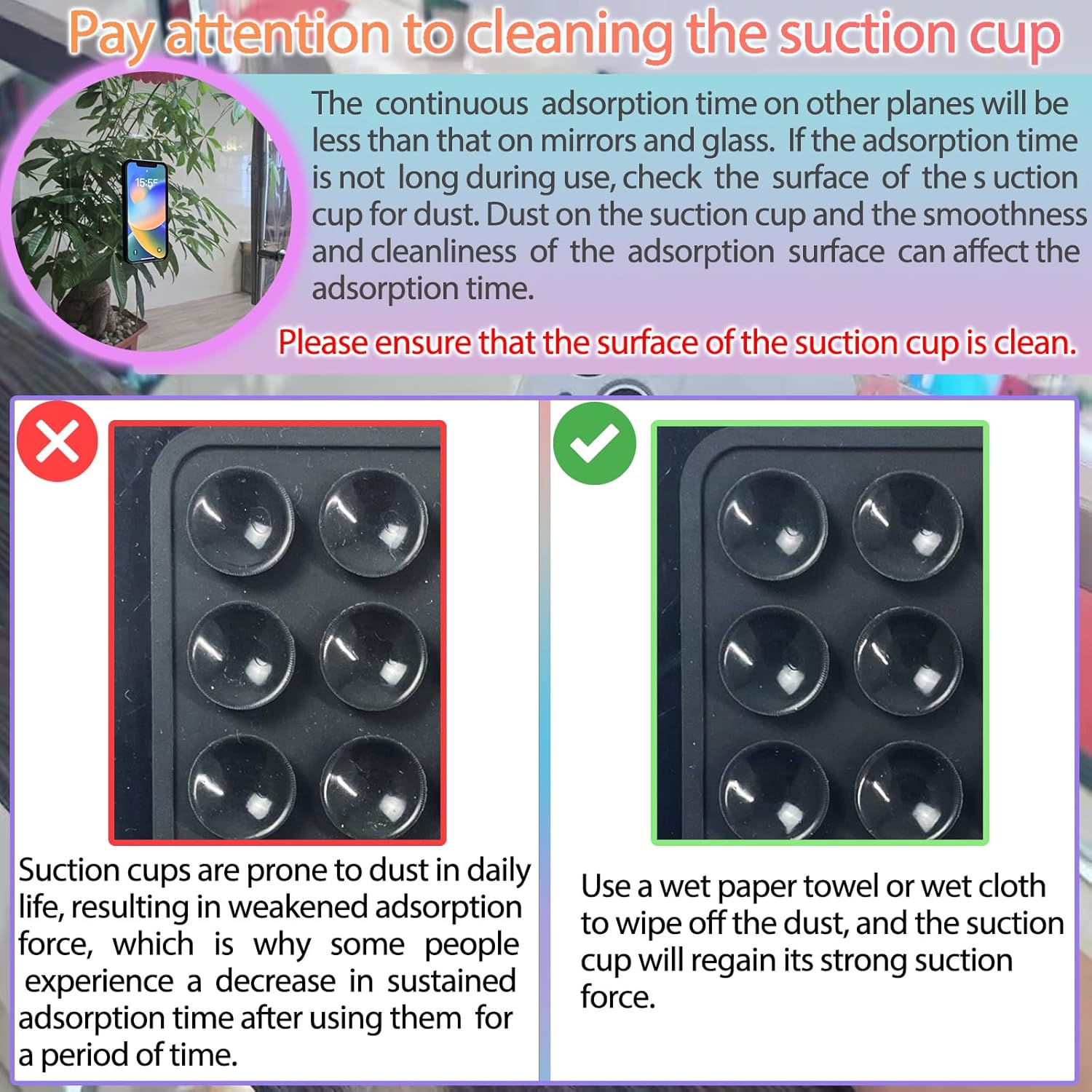 Keep clean: Please regularly clean the dust on the phone suction cup surface, as it will affect the suction force of the suction cup.The adsorption time is related to the smoothness of the surface of the adsorbing object, and the effect of adsorption on mirrors and glasses is the best.The suction power of the suction cup phone mount will gradually weaken over time. It is recommended to use it for a maximum of half an hour at a time.