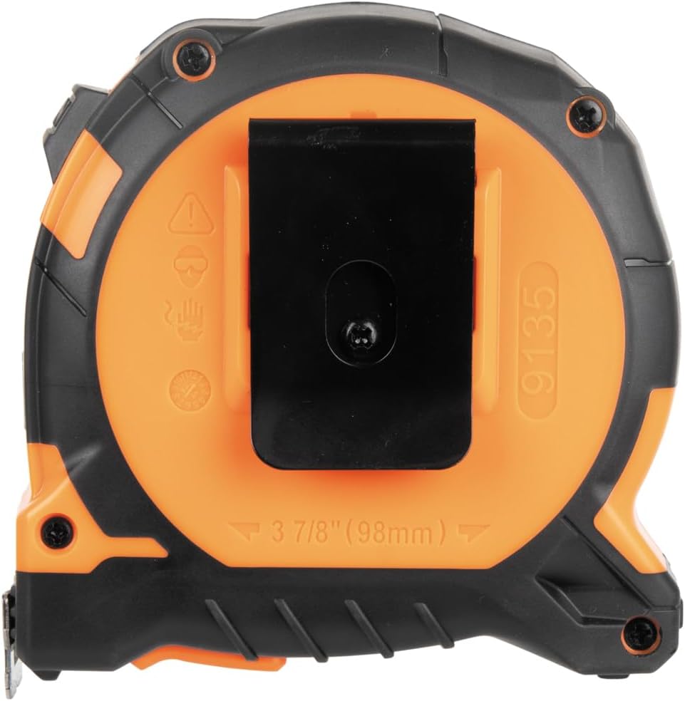 METAL BELT-CLIP AND TETHER HOLE: Metal belt-clip securely holds the tape measure to belts, pockets, or pouches, while the integrated tether hole allows for use at height