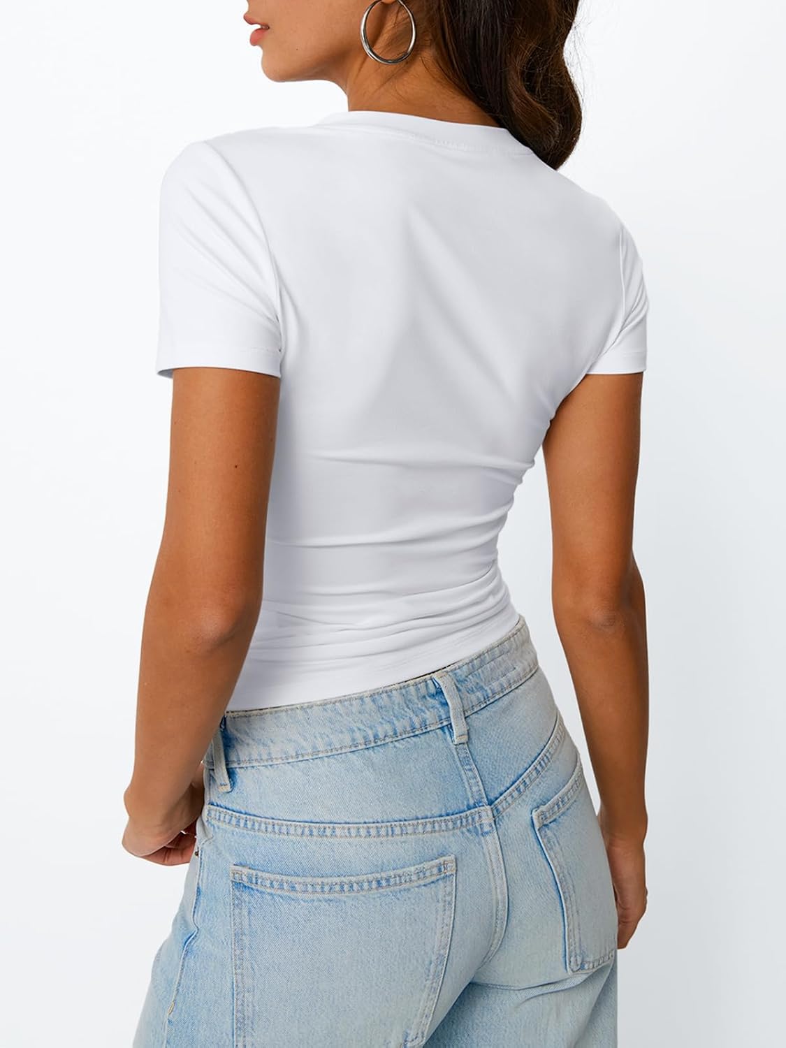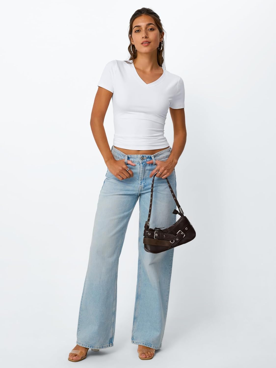 Design: This top features a soft, comfy, and casual style with a V neck and short sleeves. It comes in both cropped and regular styles, giving you the option to wear it as a regular top or fold it up for a trendy top look