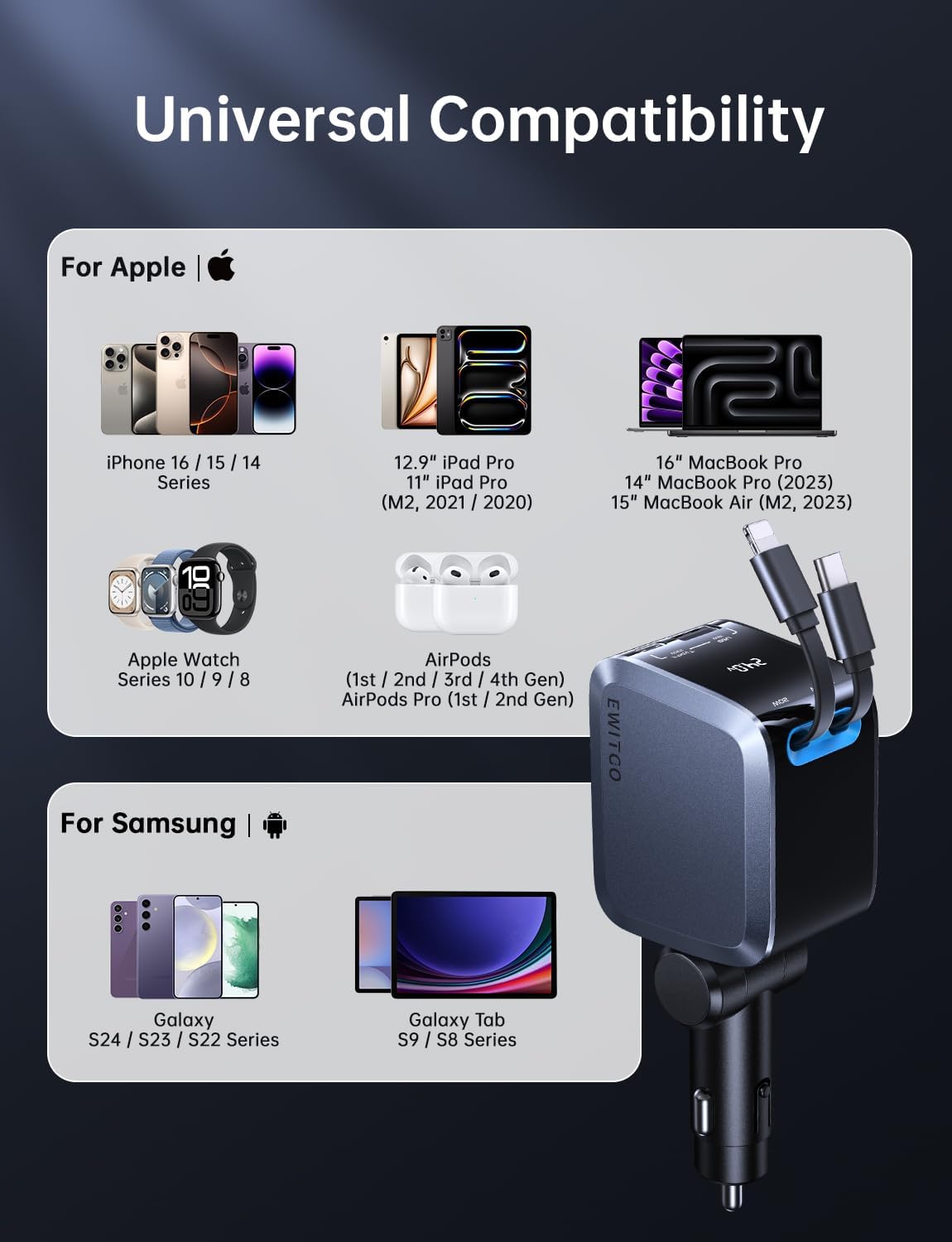 4-in-1 Retractable Car Charger: EWITGO 4 in 1 retractable car charger features two built-in retractable cables, including a 20W USB IP cable for Apple devices and a PD 30W USB C cable for modern Android smartphones. The retractable cables extends up to 31.5 inches, allowing smooth length adjustment to any position and automatically retracting, keeping your car neat and tangle-free. Additionally, it includes a USB A port and a USB C port, enabling you to charge up to four devices simultaneously
