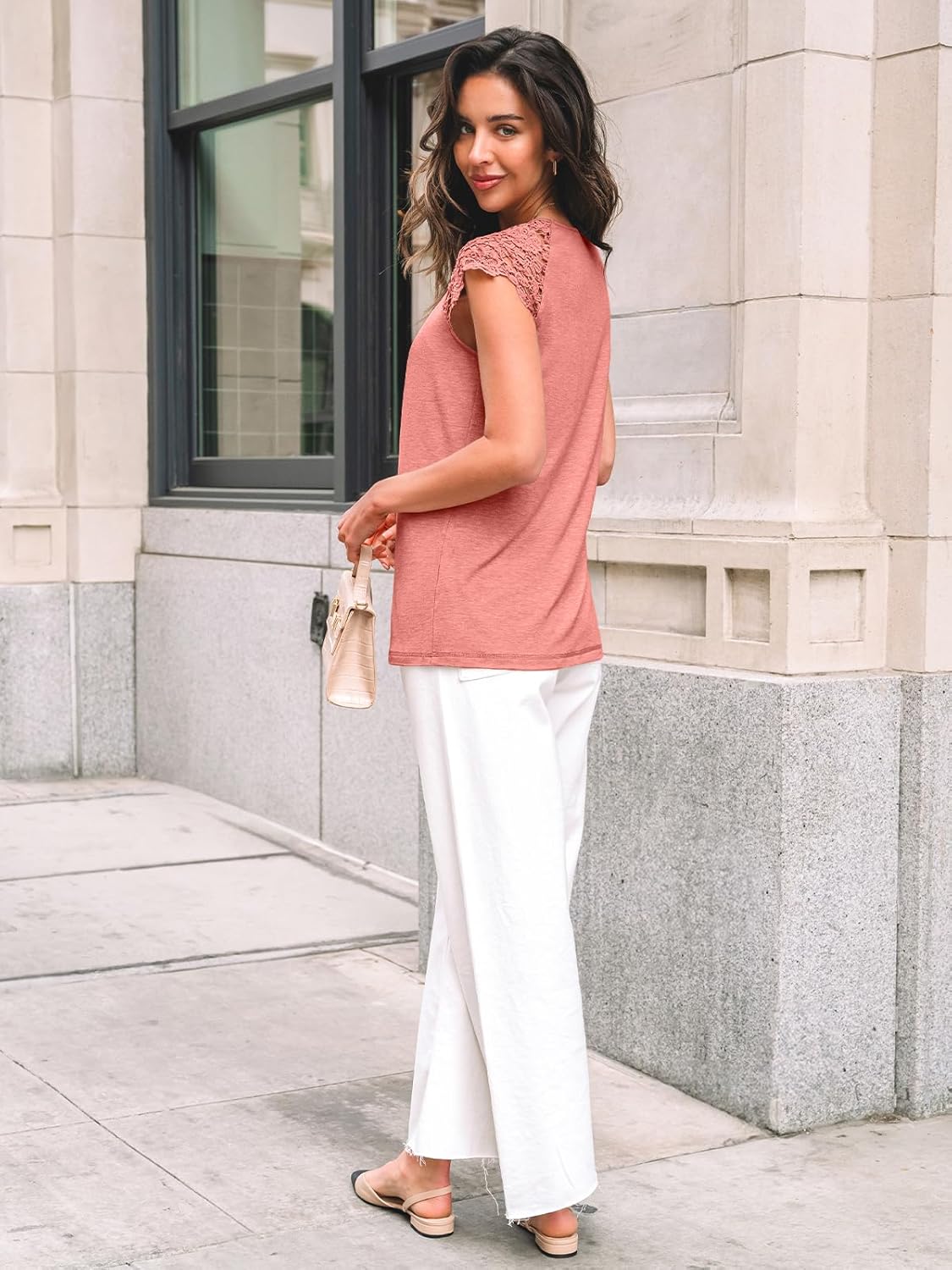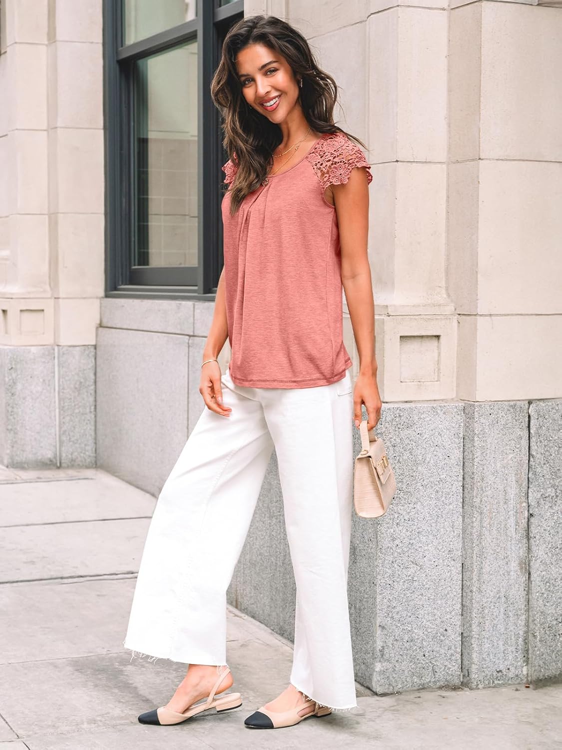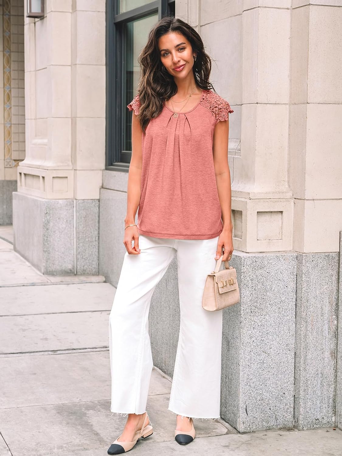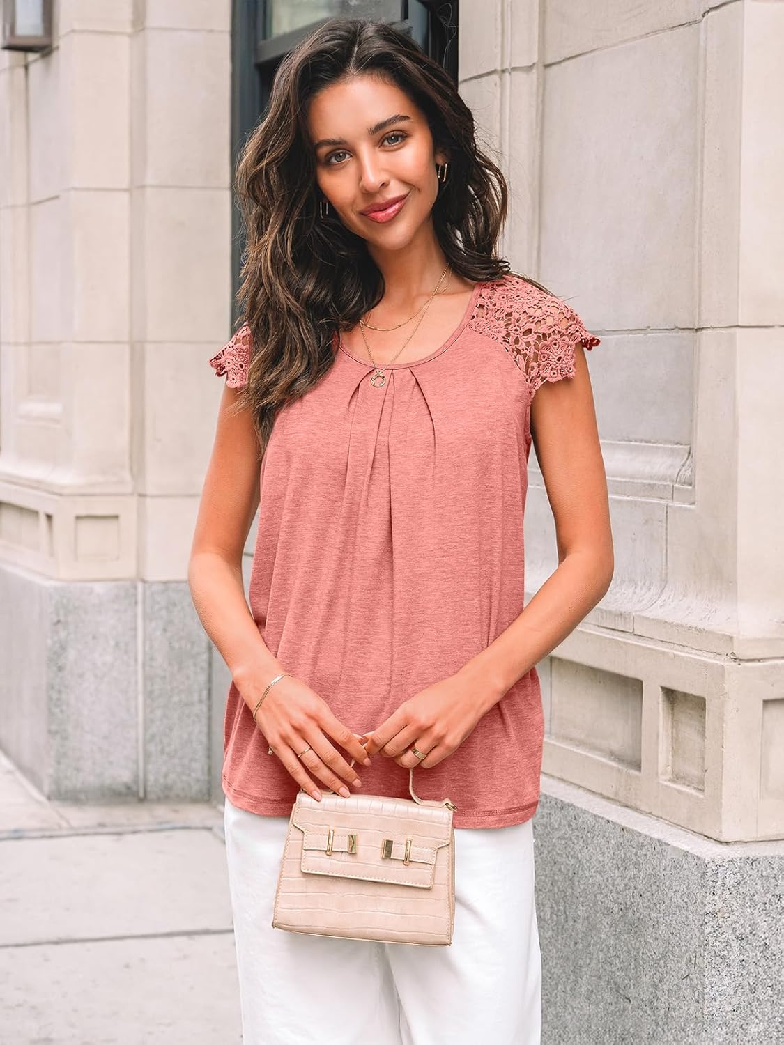Elevate your casual look or freshen a dressier outfit with this lace sleeve top. Lace cap sleeves and pleated front that create stylish drape polish the classic silhouette.