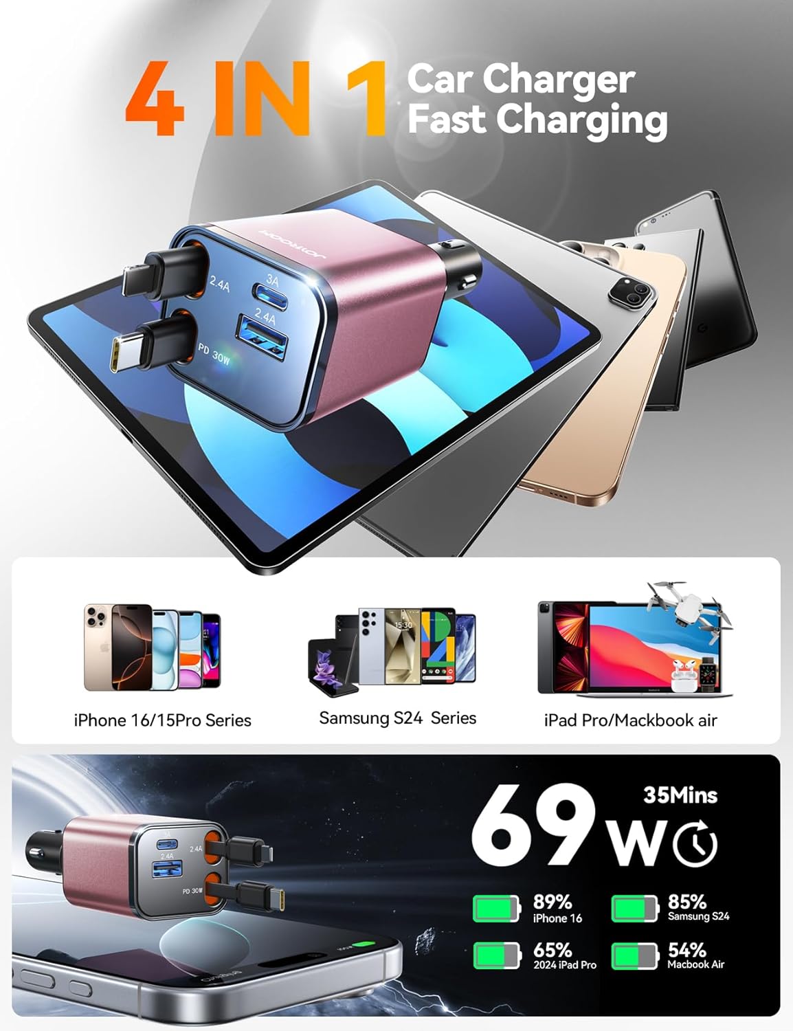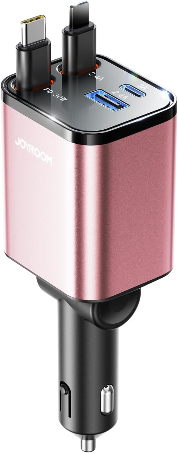 Ⅱ: Versatile and Powerful 4 Ports Car Charger - JOYROOM 69W Retractable car charger 4 in 1 with USB-C and USB [QC15W+QC12W] ports and 2 multi-functional retractable cables (PD30W+12W) for charging up to 4 devices at the same time. Whether you're looking for car accessories for men or women, that‘s a nice choice. Makes your car more neat and organized with this smart car organization solution. Smart car charger usb c efficient power distribution ensures full speed charge all your devices without slowing down the charging speed