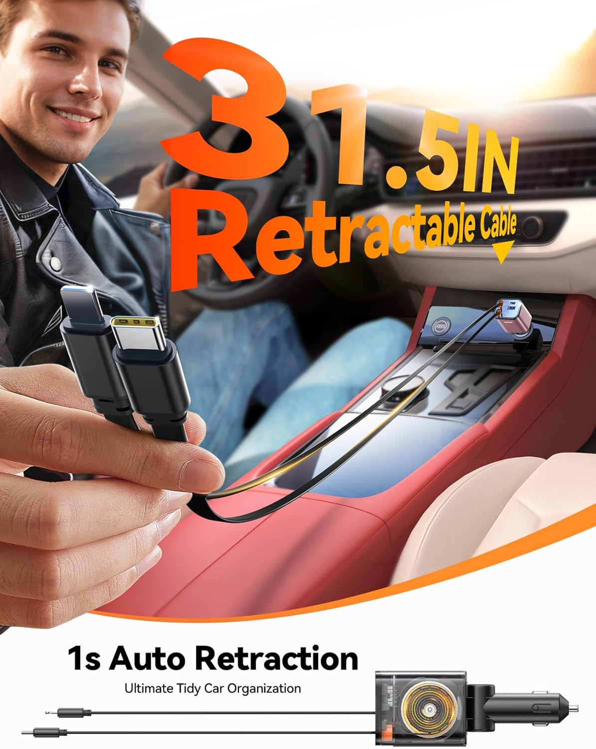 Ⅰ: First Compact and Car Organization Charging Solution - JOYROOM 2025 New Upgrade Smallest 4 in 1 Retractable Car Charger, measuring 5.11 x 1.77 x 1.49 inches, solves the risk of other bulkly retractable car charger affecting driving and more perfectly fits car cigarette lighter. It supports 180° rotation, and features 2 multi-functional retractable cords extending up to 31.5 inches (80CM). As one of the must-have car accessories essentials for family travel, its compact design saves space, making it perfect for tight areas like trucks, old vehicles. It's ideal for iPhone and Android users, including iPhone 16 Car Charger USB C as well as USB port and USB-C devices users