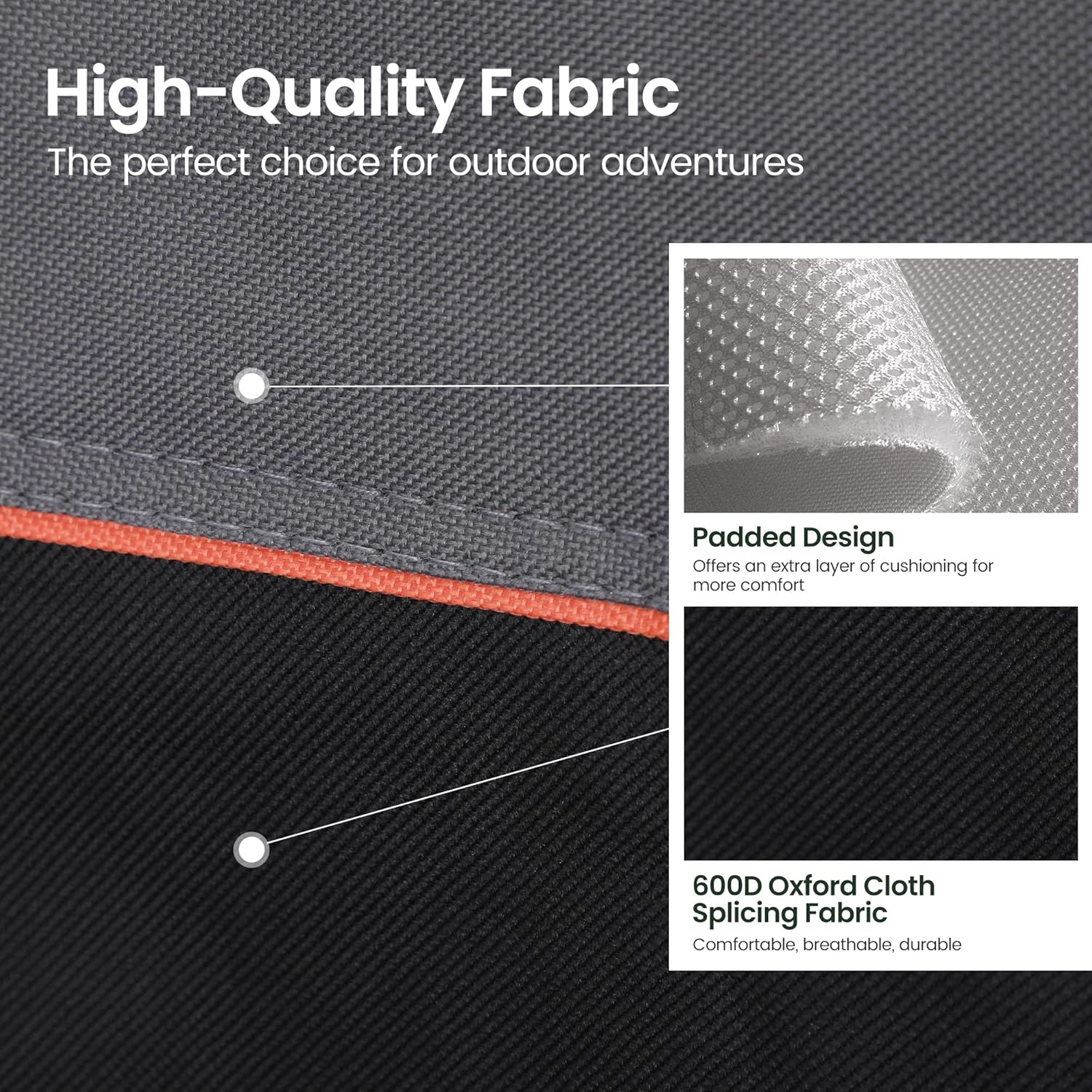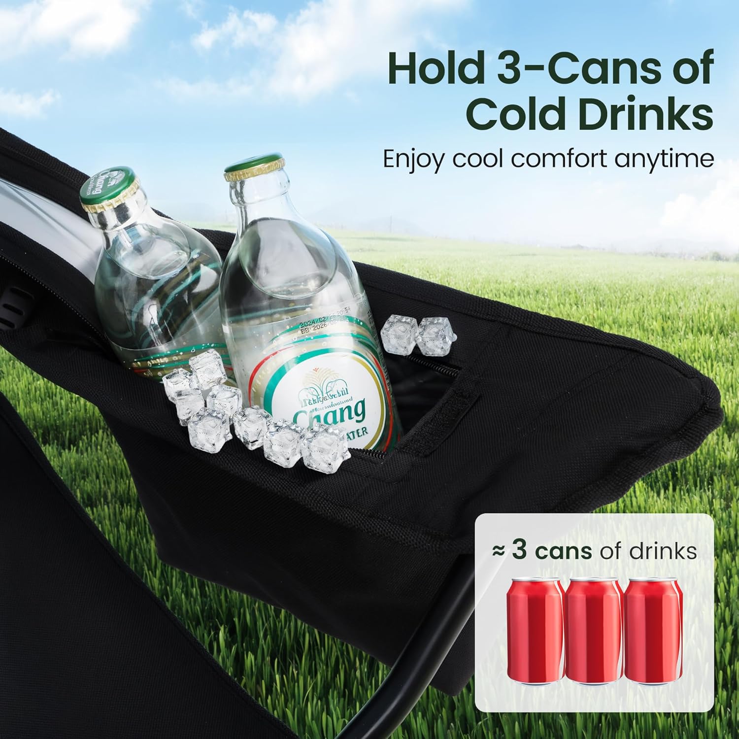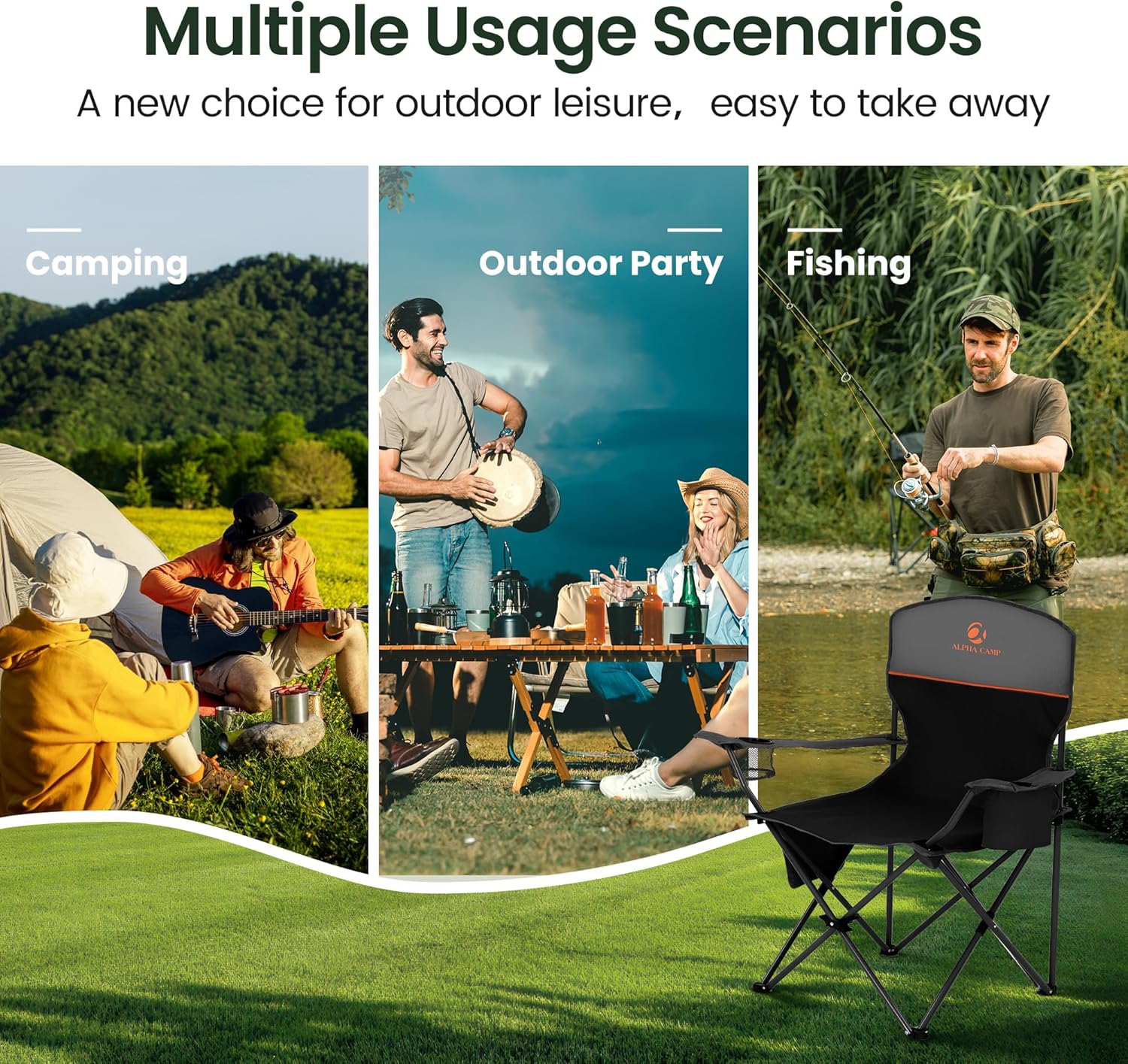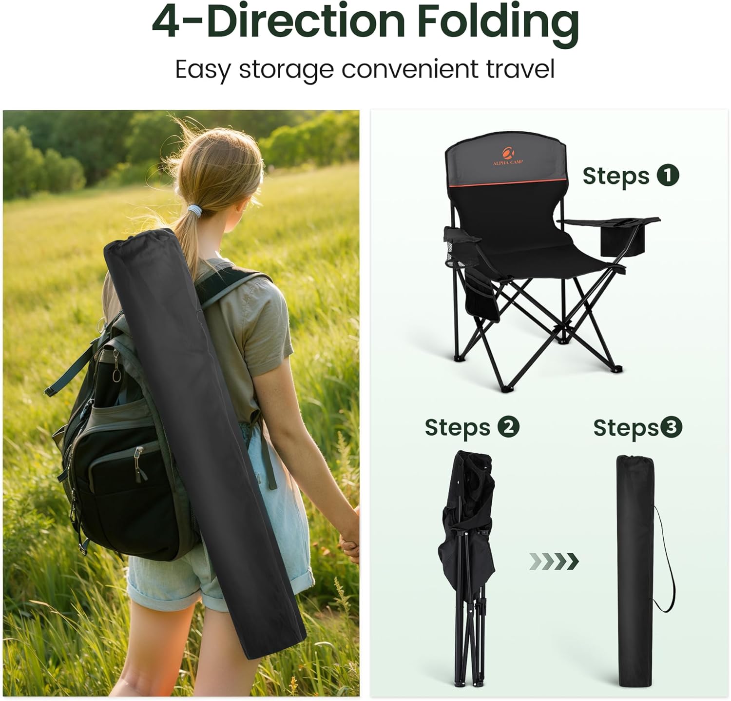 Portable and Excellent: This portable camping chair is foldable. It is easy to set up and no tools required. This camping chairs for adults heavy duty with a carrying bag is easy to store and transport for travel or camping