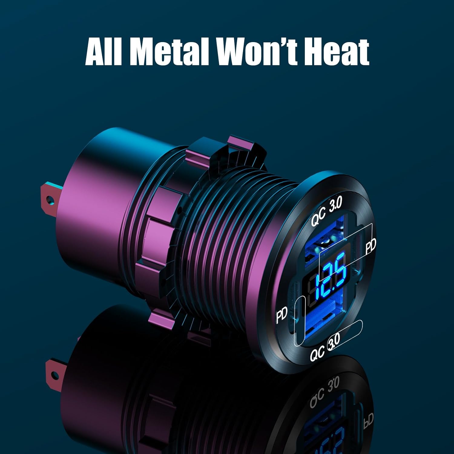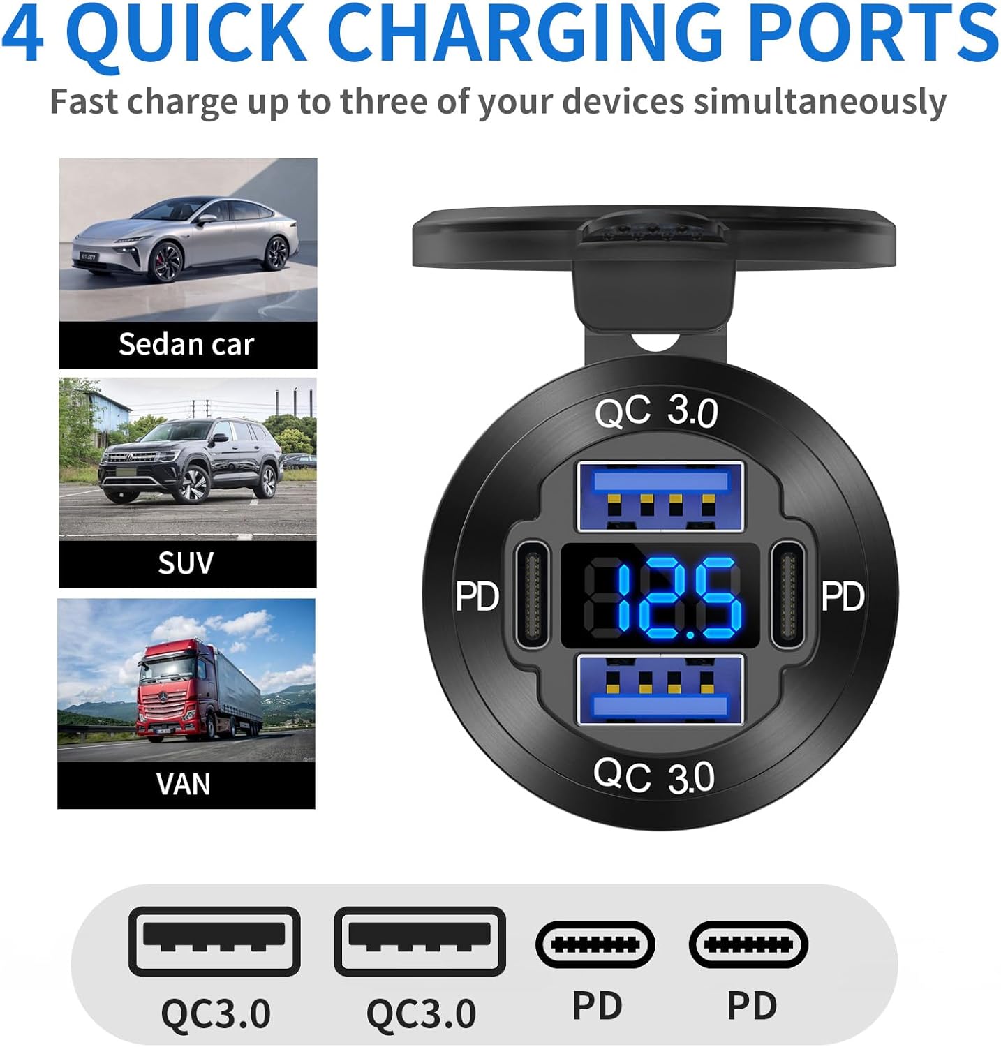 78W Fast & Efficient Charging: The 12v usb outlet has 2 PD 30W and 2 QC3.0 18W fast charging ports that can charge up to 4 devices at the same time with up to 78W output. Backward compatible with Quick Charge 2.0 and 1.0. it is compatible with most vehicles with DC 12-24V connections, suitable for providing fast charging speeds for all popular USB or USB C devices.