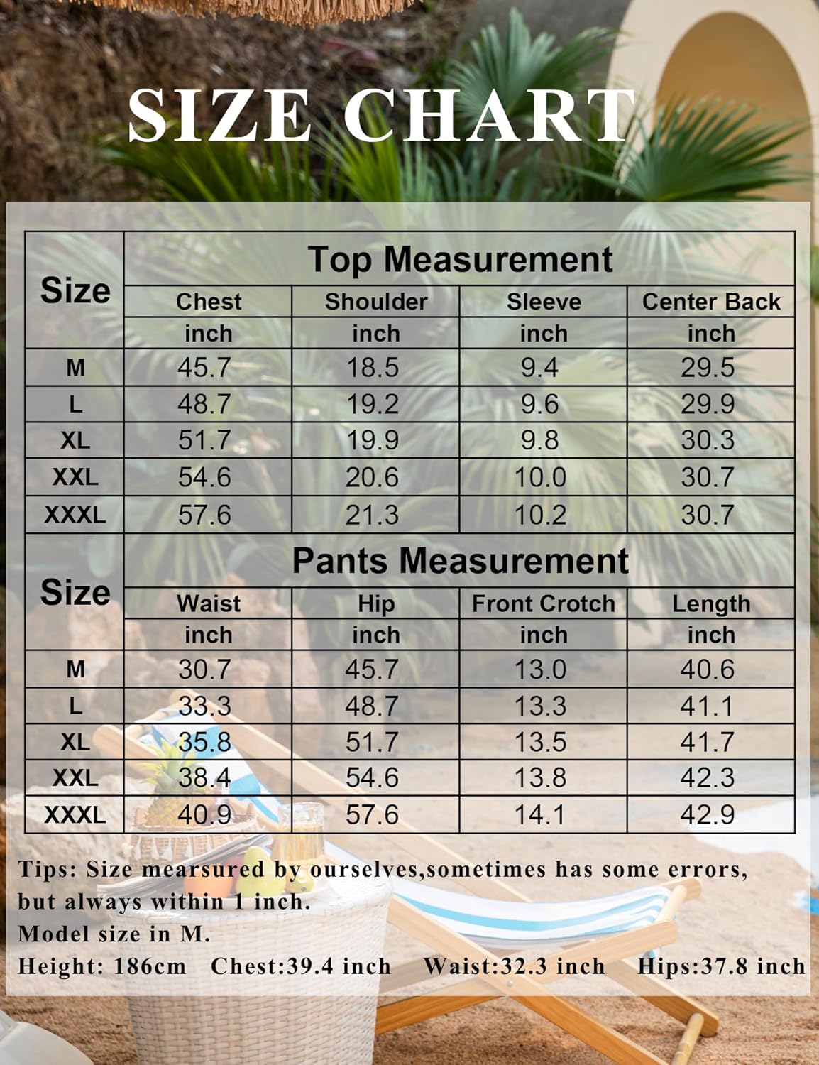 Mens Vacation Outfits 2 Piece Set: Solid button down shirt for men is featured with short sleeve, lapel collar, unique texture.Beach casual pants with stretchy waist and adjustable drawstring to maximize comfort. 2 side pockets for storing your belongings