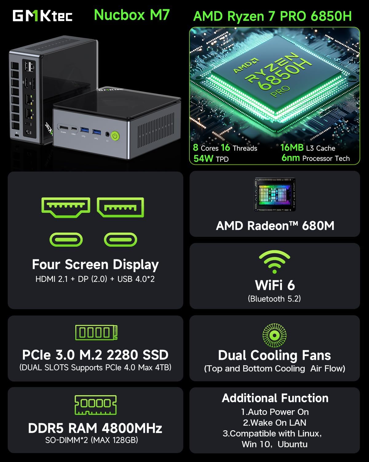 【32GB DDR5 Dual Channel RAM & 512GB PCIe SSD Dual Slot Expansion】Installed with DDR5 32GB RAM 4800MHz (Dual Channel 2x16B), the Nucbox M7 mini pc support expansion to 128GB RAM. Featured with 512GB M.2 2280 PCIe 3.0 SSD, supports dual slot expansion to 2*PCIe 4.0 2TB SSD up to 4TB. (Upgrades not included)