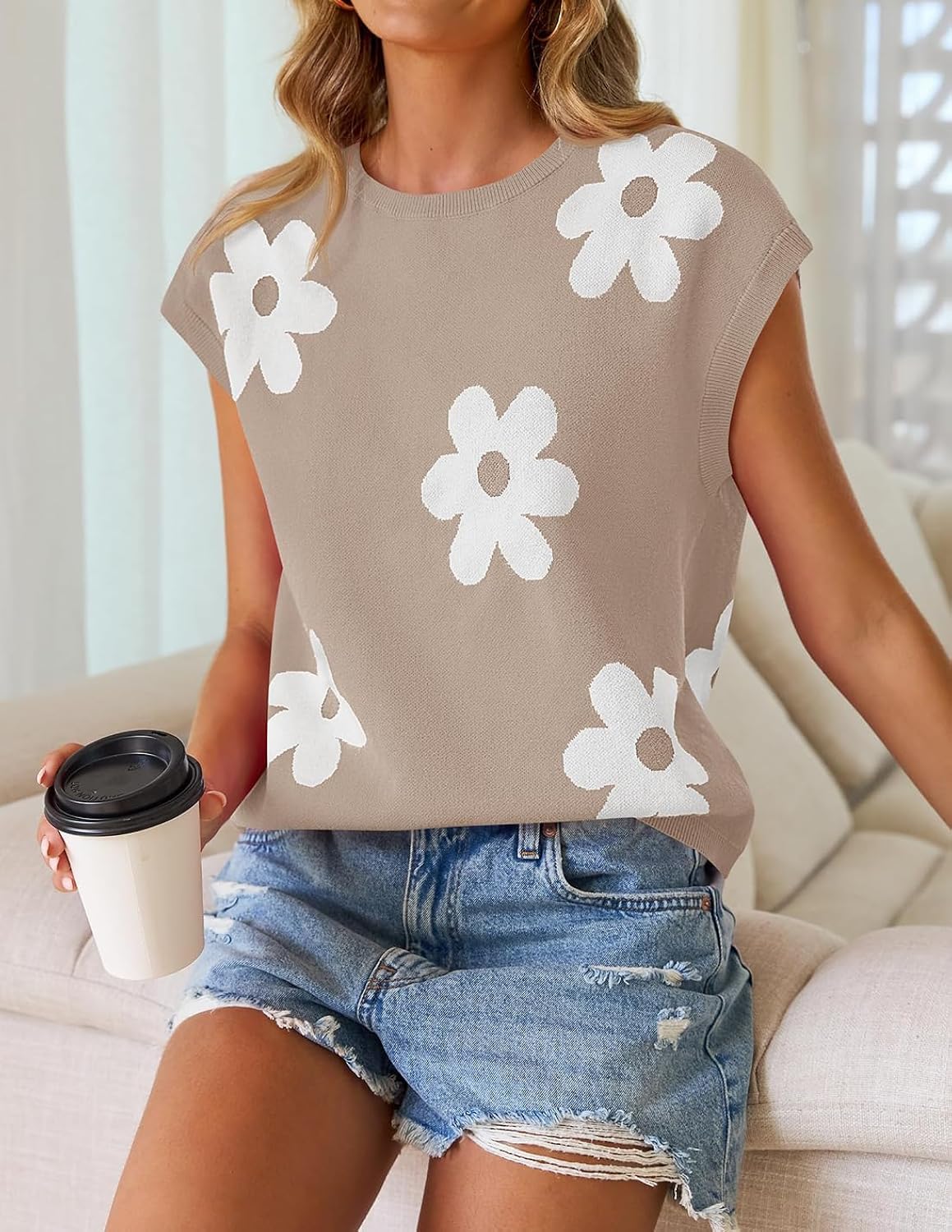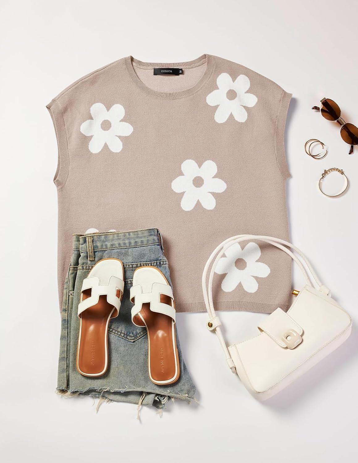 ZESICA Womens Summer Casual Printed Tops Cap Sleeve Crew Neck Cute Knit Sweaters 2025 Trendy Clothes Outfits
