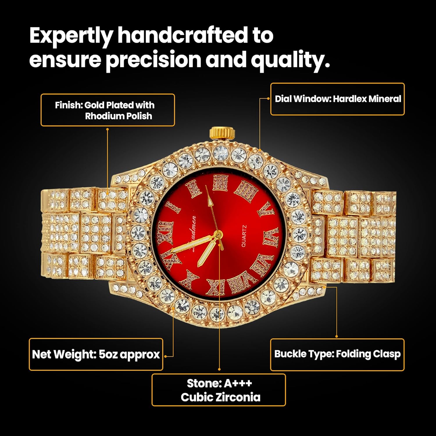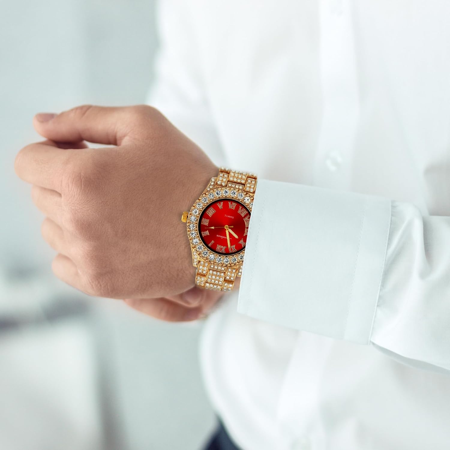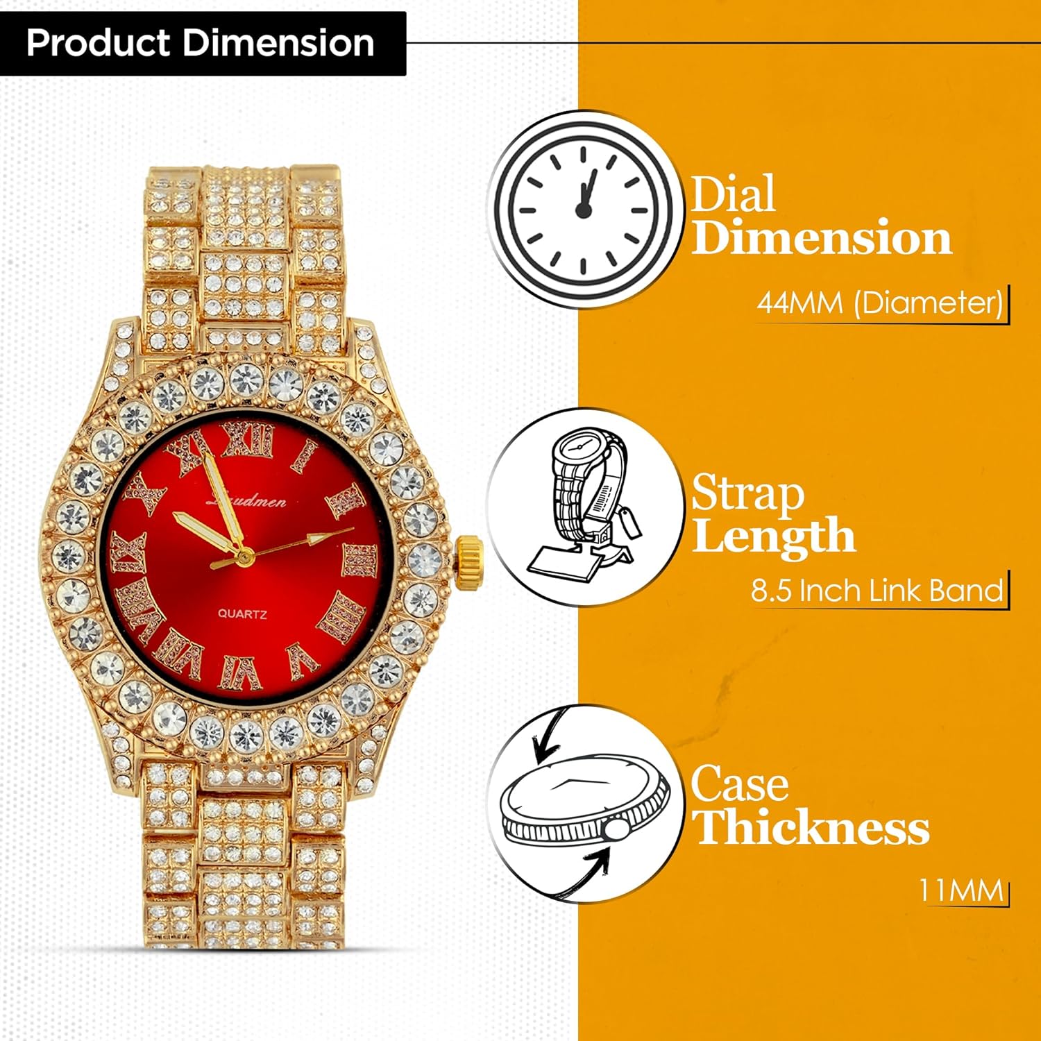 Bold, Dazzling Design – Turn heads with this fully iced-out 44MM gold-plated watch, featuring a vibrant, easy-to-read numerical dial and a brilliant iced bezel that reflects light from every angle. Designed for those who embrace bold fashion, this timepiece exudes confidence and sophistication.