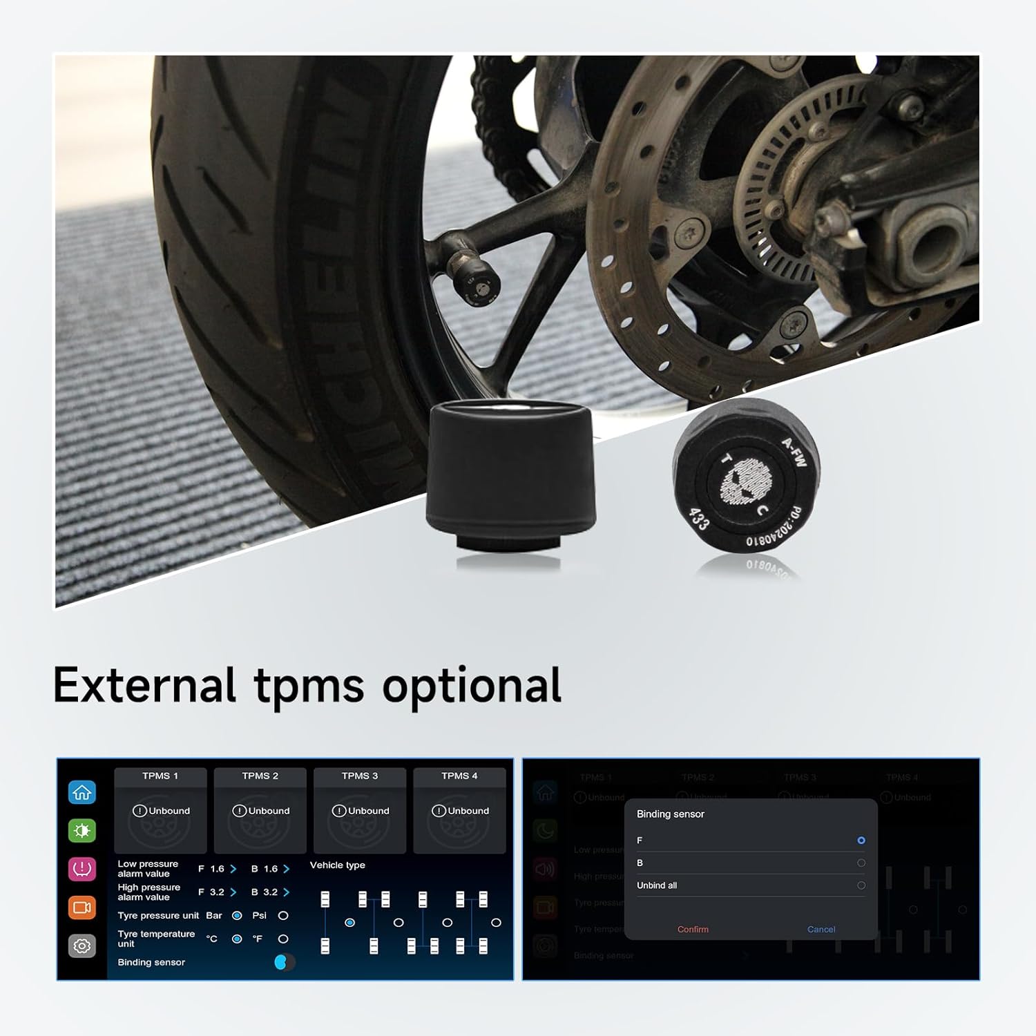 Real-Time Tire Pressure and Temperature Monitoring – Provides comprehensive tire pressure and temperature monitoring functions, displaying tire data in real-time and alerting you in case of abnormalities to ensure driving safety. Multi-tire display is supported, making it suitable for motorcycles and various vehicle types.