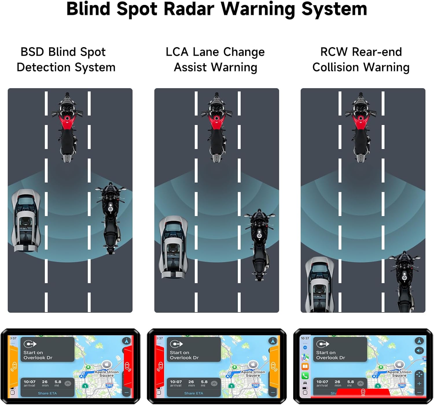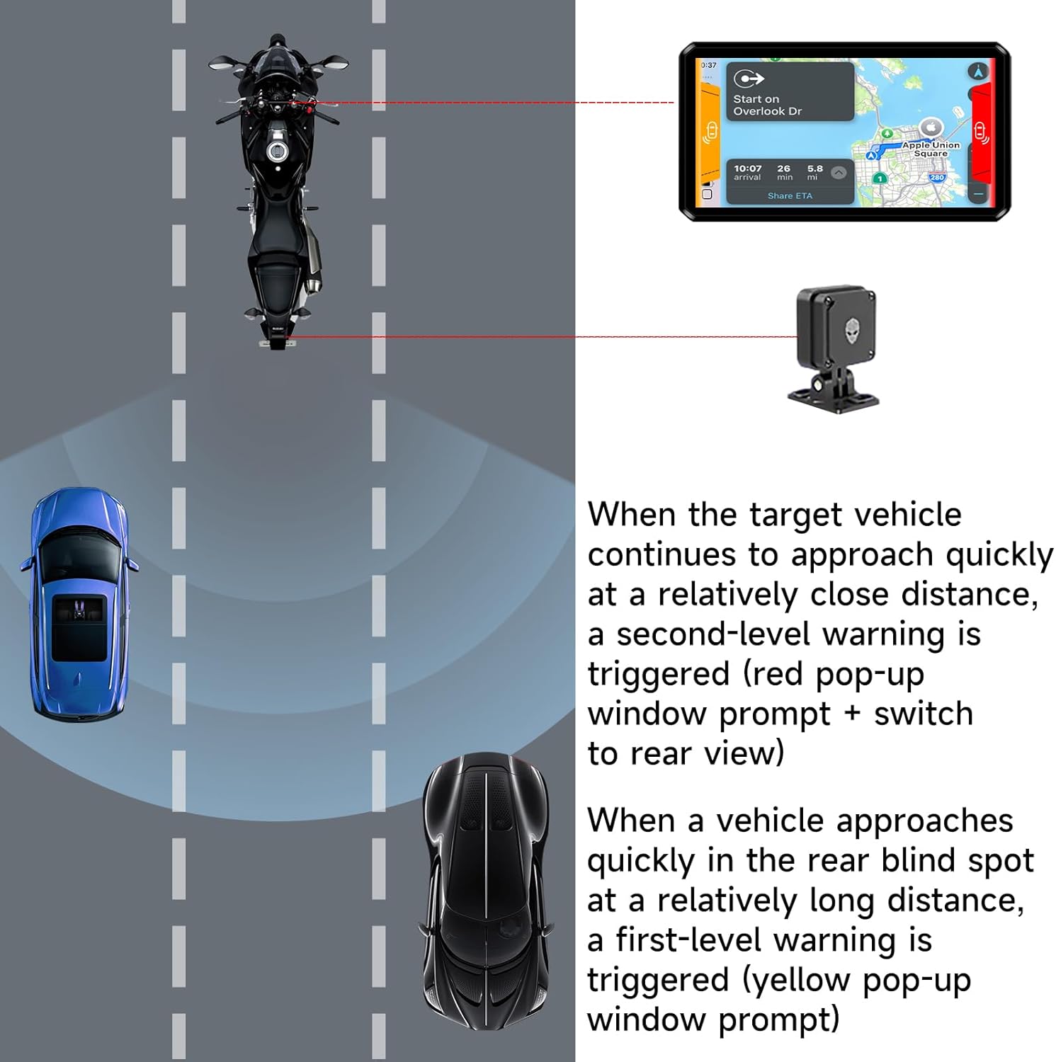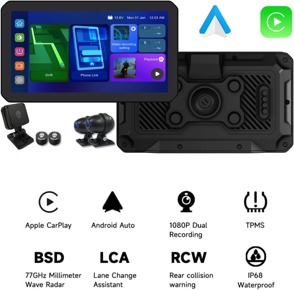 AlienRider M12S Motorcycle 77G Millimeter Wave Radar Blind Spot Warning,Dash cam Front and Rear,Wireless CarPlay/Android A...
