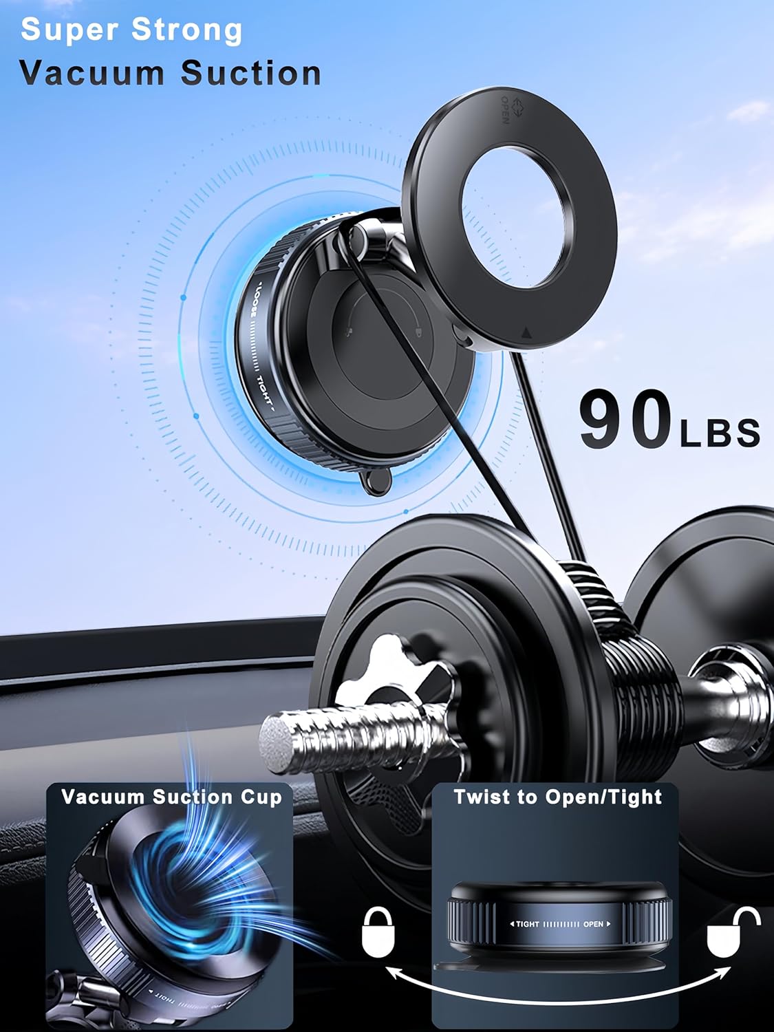 【Multi-Angle Adjustment】Equipped with powerful N55 magnets, this vacuum magnetic phone holder delivers strong magnetic attraction, aligning precisely with the magnets inside your phone. Rigorously tested over 8,000 times, the magnetic phone holder provides an impressive 1,000 GF of magnetic force to securely hold your phone with ease. Featuring a rotating aluminum alloy support arm, it offers 360° adjustability to accommodate all your navigation needs while driving.