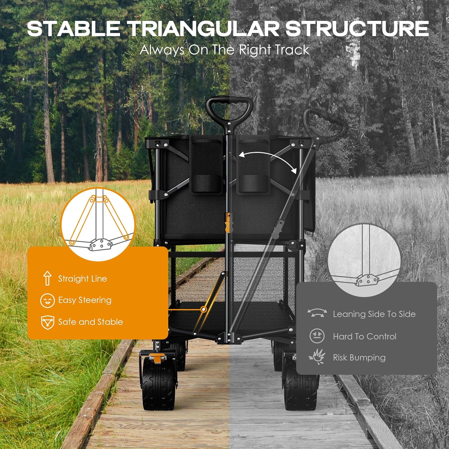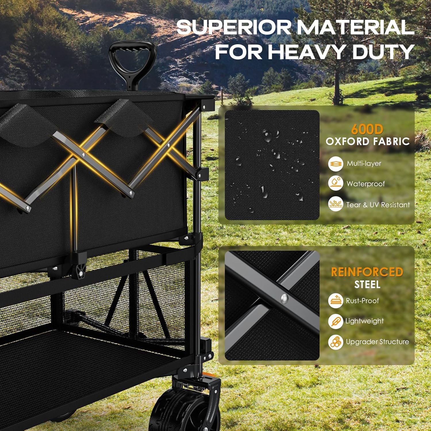 Enhanced Capacity of 400L: Accommodate all your essentials in a single trip, minimizing the need for multiple journeys! This exceptional collapsible wagon surpasses other wagons by 5X more efficient and stands out as the epitome of efficiency! But wait, there's more! With a double-decker design, it boasts the most stable structural frame and is crafted from 600D waterproof oxford fabric, enabling it to support up to 485 lbs with ease.