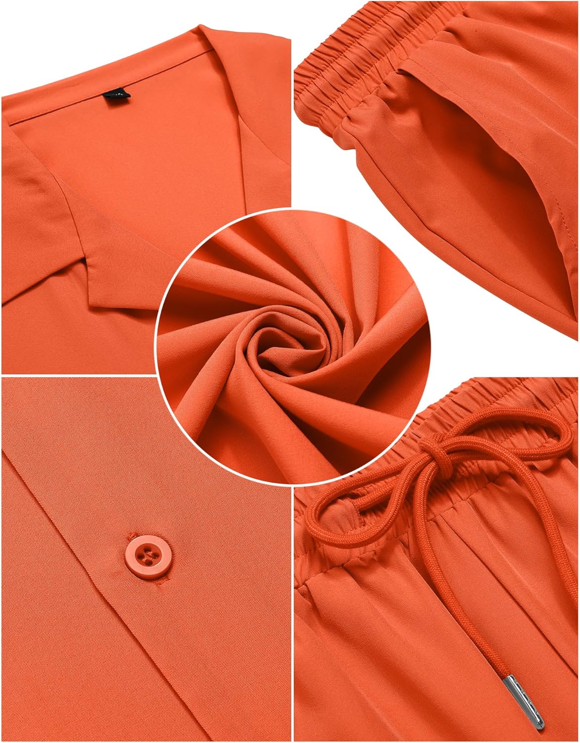 Material: Casual fashion men's summer 2 piece set is made from 95 % polyester and 5% spandex,solid color button down shirt and pants two piece set for men has a slight stretch, soft, comfortable, breathable, and skin-friendly, stylish men's 2 piece pant sets, casual short sleeve shirt set.