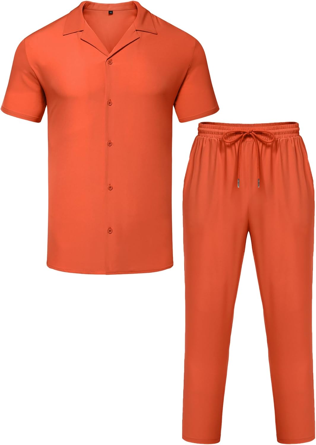 Design: Classic fashion 2 piece mens summer outfits, men tracksuit 2 piece set, black/orange/white/pink/khaki/beige men button shirt & pants, regular fit, plain color shirts tops, button down closure, one hip pocket, short sleeve and high-rise elastic waistband pants, side pockets, basic solid plain color, adjustable waist drawstring. A must-have summer outfit sets in your wardrobe!