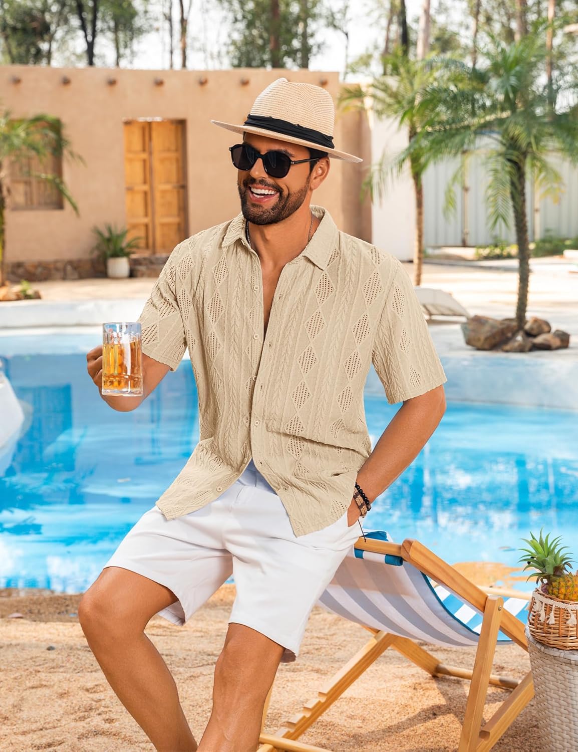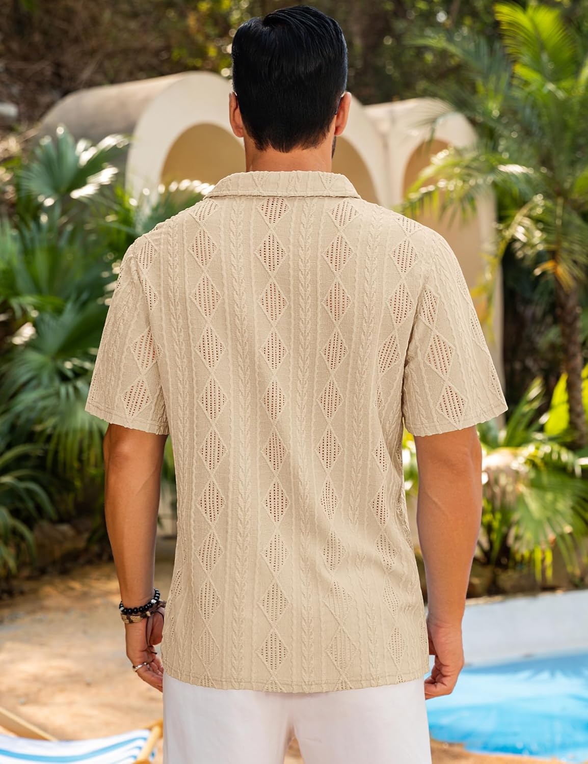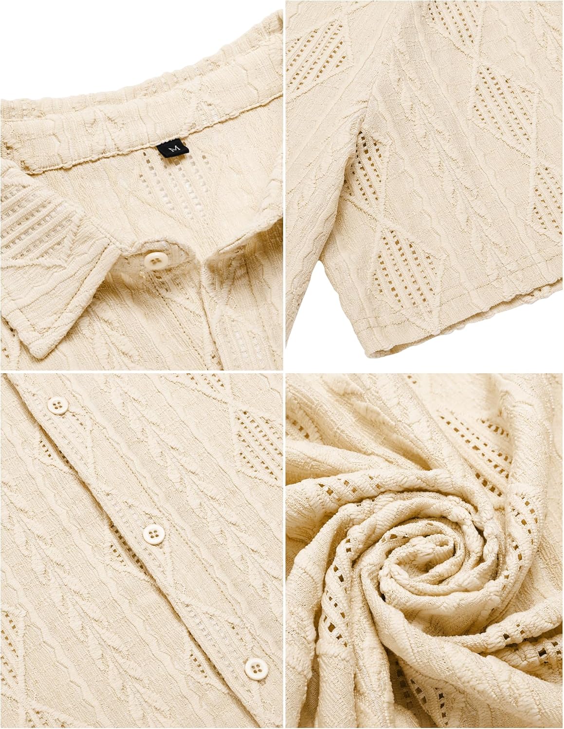 Design: See-through mens Crochet shirt, hollow out mesh shirts, button down closure, short sleeve, lapel collar, basic solid, diamond jaquard. A must-have summer outfit in your wardrobe!
