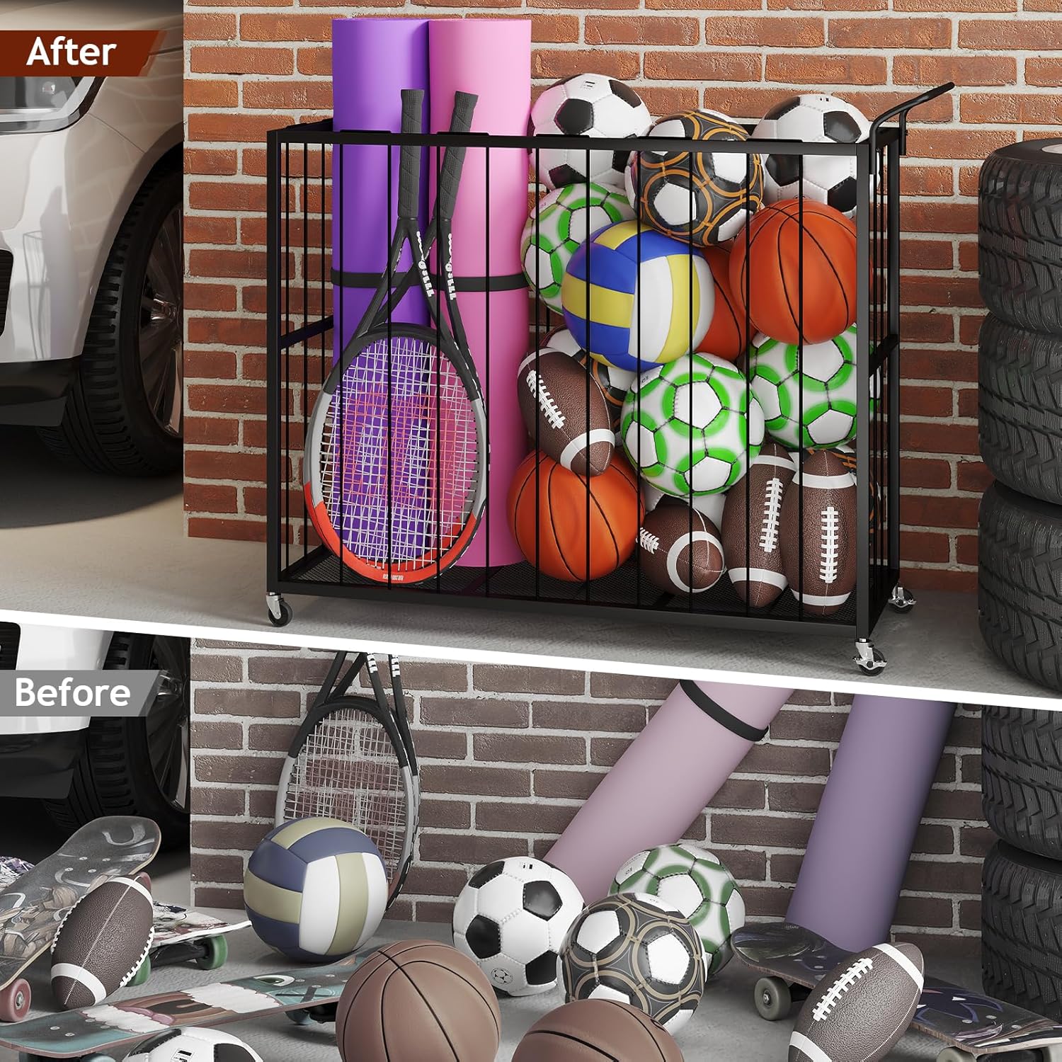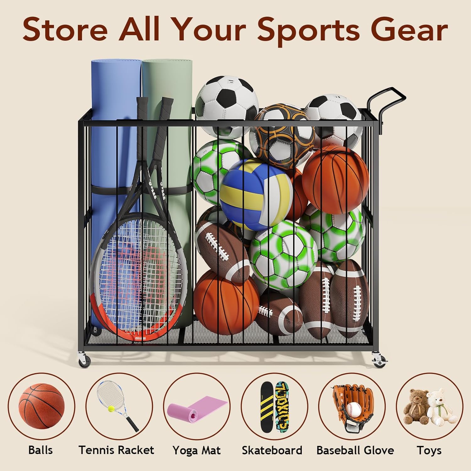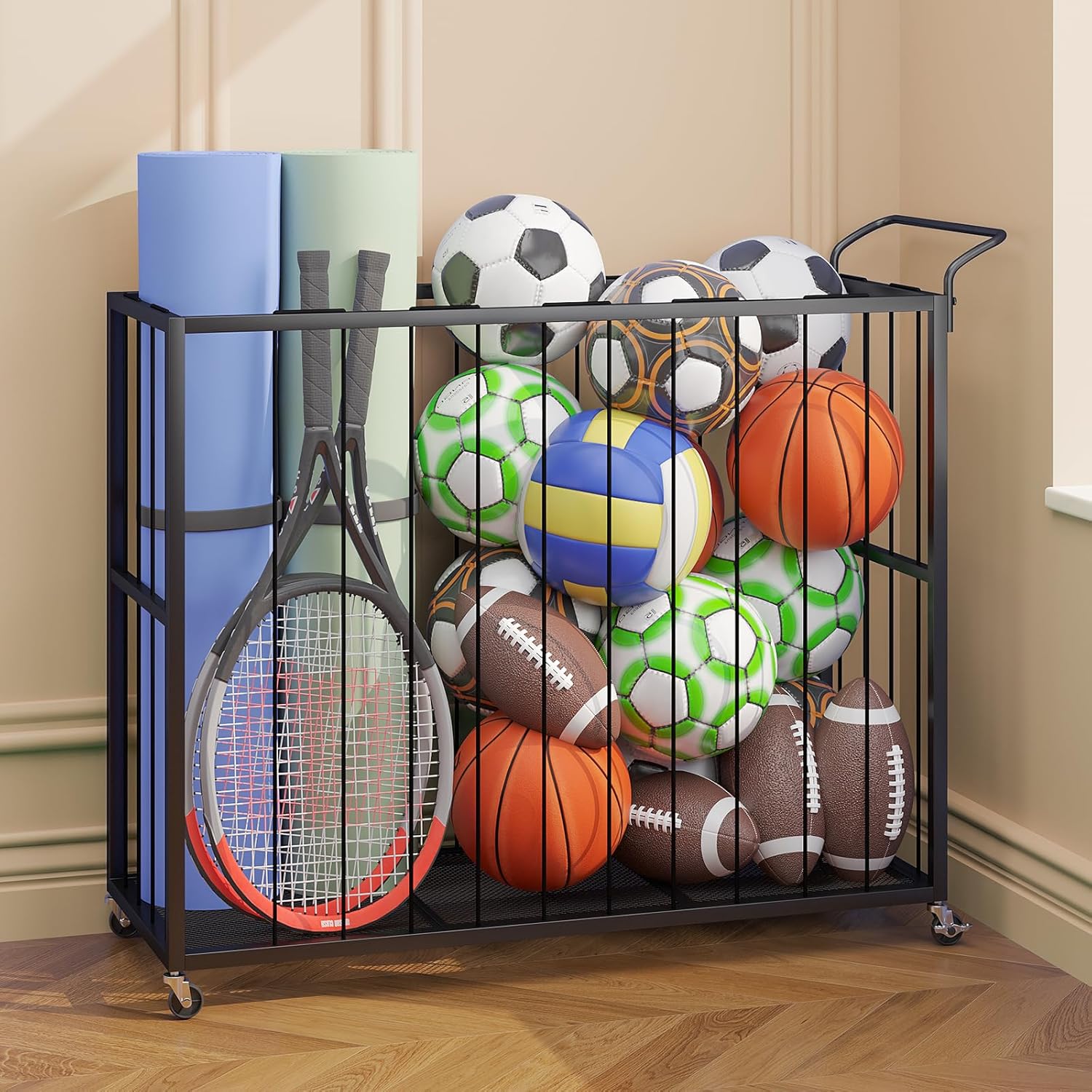 Homsorout Ball Storage Bin Rolling Sports Ball Cart, Metal Garage Organizer Sport Rack, Ball Basket Storage, Ball Cage for...
