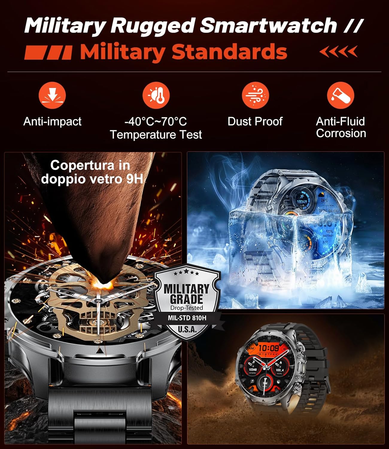 ?【Flashlight on the Wrist】The military smart watches for men is equipped with a powerful flashlight on its side, with a lighting range of 6-8 meters. It serves as a reliable travel companion, perfect for camping, hiking, nighttime adventures, and the spotlight helps illuminate your path in the wilderness. It makes your nighttime outings safer, fearlessly supporting any outdoor exploration! The flashlight also acts as a backup light source in emergencies, such as power outages, nighttime car breakdowns, or any situation requiring immediate illumination. Additionally, it can be used as a signal light in critical moments, emitting a distress signal to the outside world when activated.