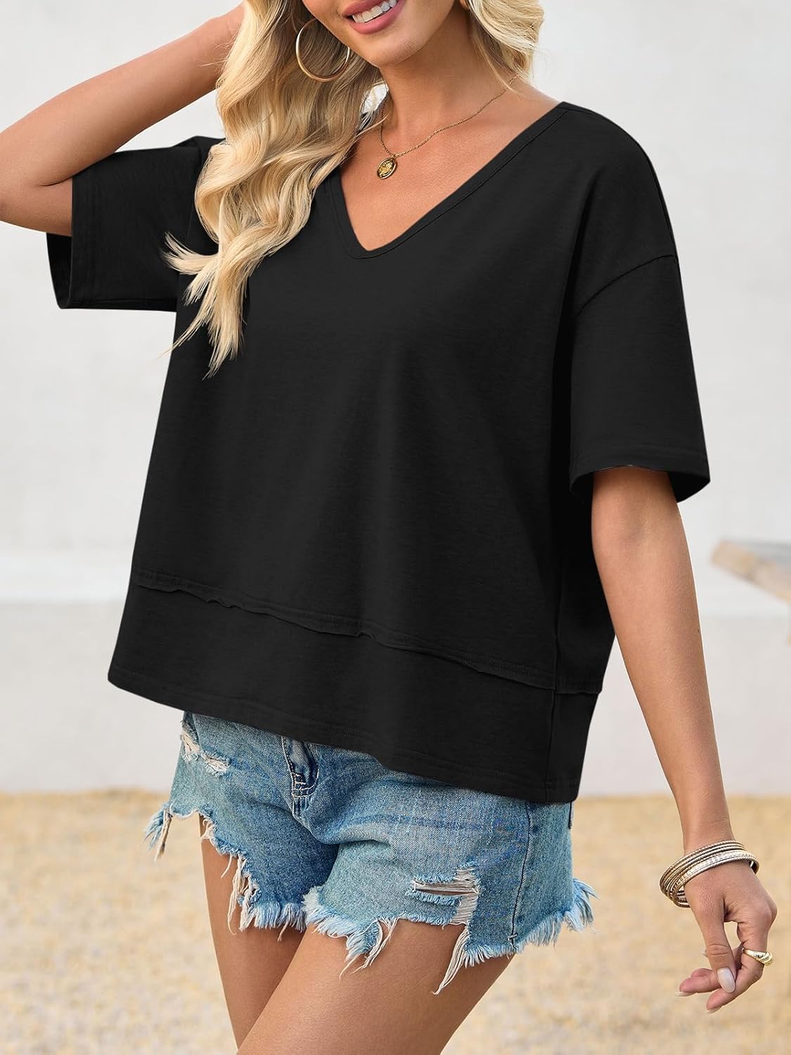 Flattering V Neckline: The elegant V neckline elongates the neck and adds a touch of sophistication, while the short sleeves ensure a relaxed, casual vibe. The flowy hem adds movement and enhances the overall silhouette