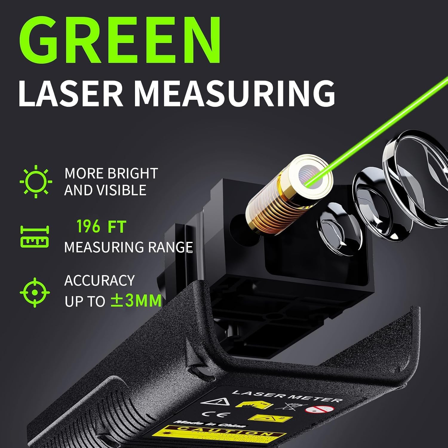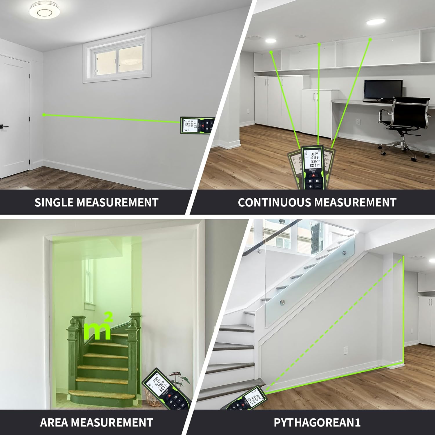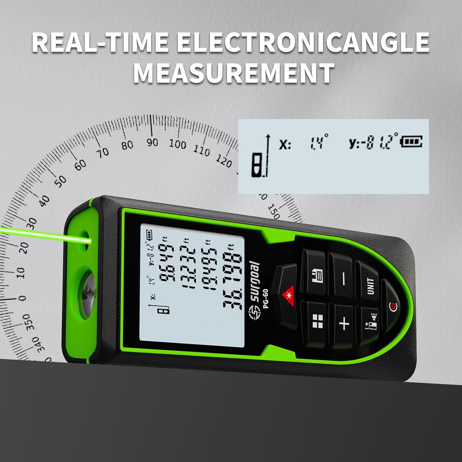 【Brighter & Clearer Green Laser】Equipped with a green laser that's up to 4x brighter than red, this device ensures exceptional visibility in bright or long-distance environments. The large backlit LCD screen provides easy-to-read measurements even in low light.