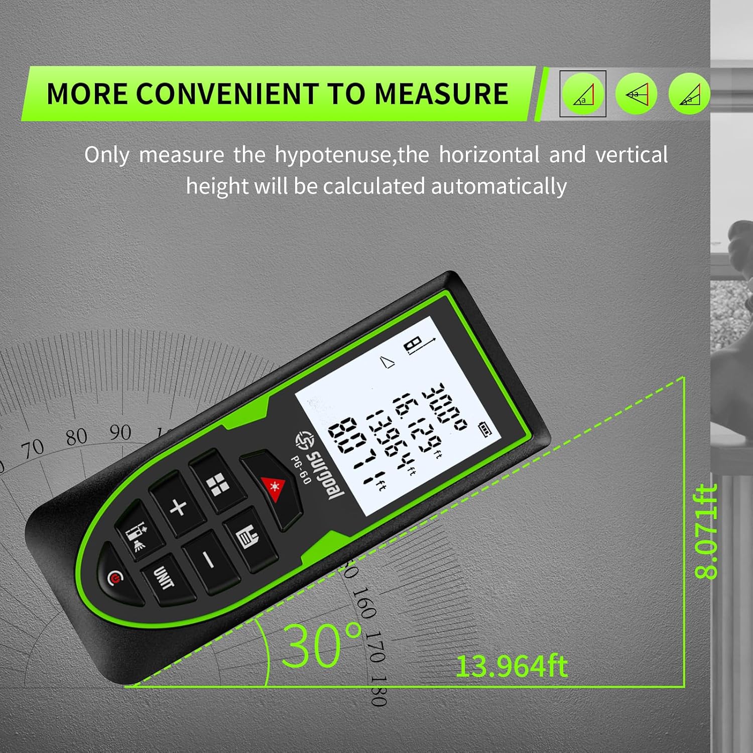 【All-in-One Measuring Modes】Supports length, area, volume, Pythagorean height measurement, and real-time angle. Great for contractors, real estate professionals, surveyors, and DIYers needing accurate spatial data.