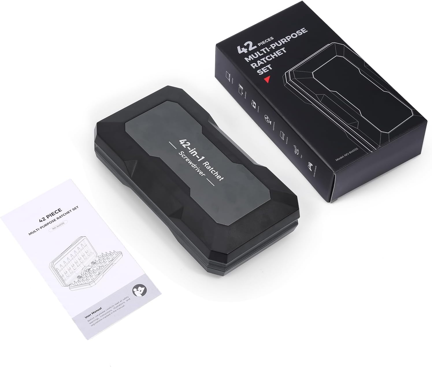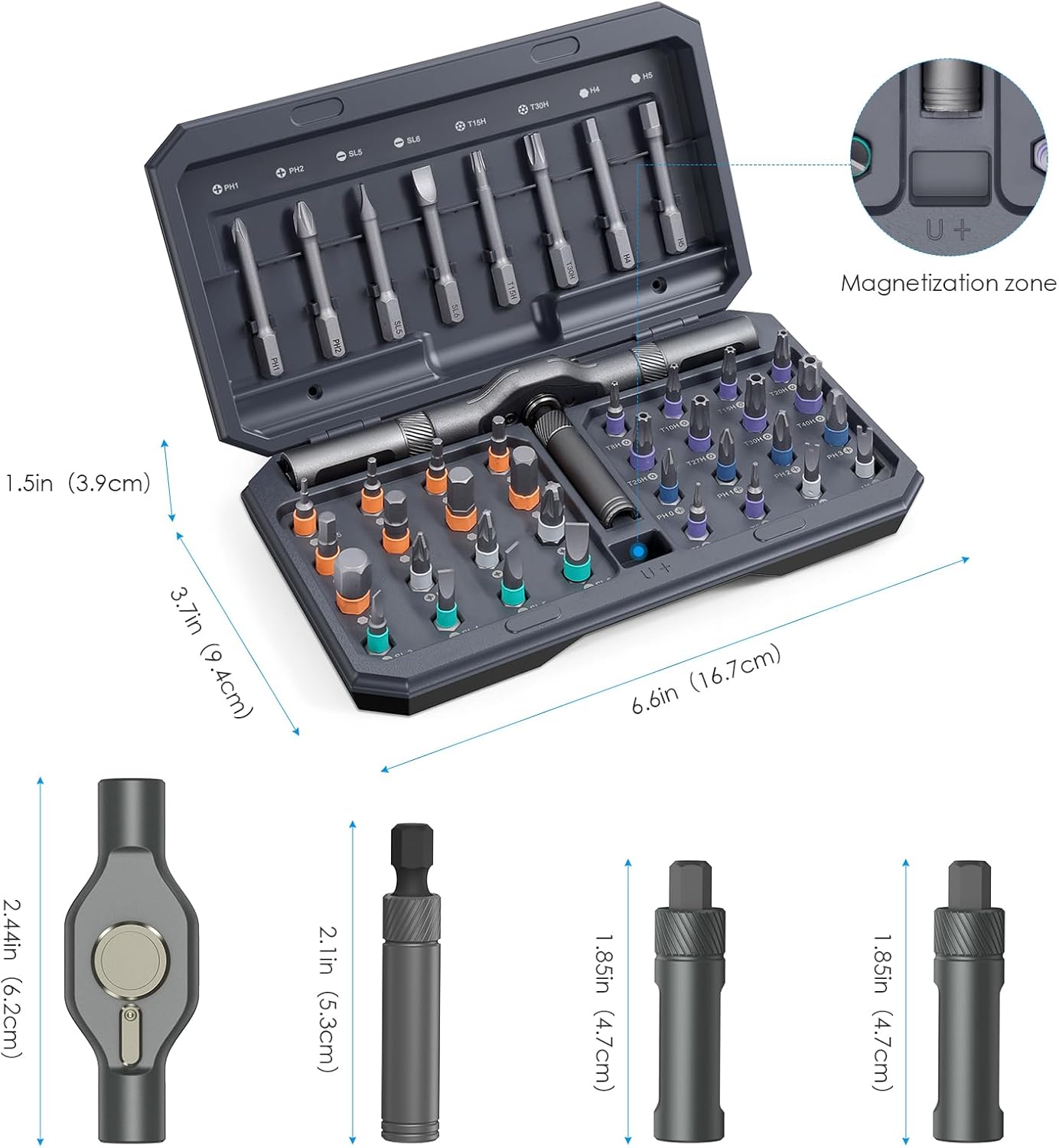 【Effort-Saving Ratchet Design】The aluminum alloy handle multi-bit screwdriver incorporates a 6.2-degree ratchet mechanism for effort-saving, with a 58-tooth reversible ratchet structure that reduces effort by 80%. With a torque of 50N.m/50KG, it allows easy handling of all household appliances or tools for repairs, tightening or loosening screws, saving time and energy without the need to adjust wrist positions