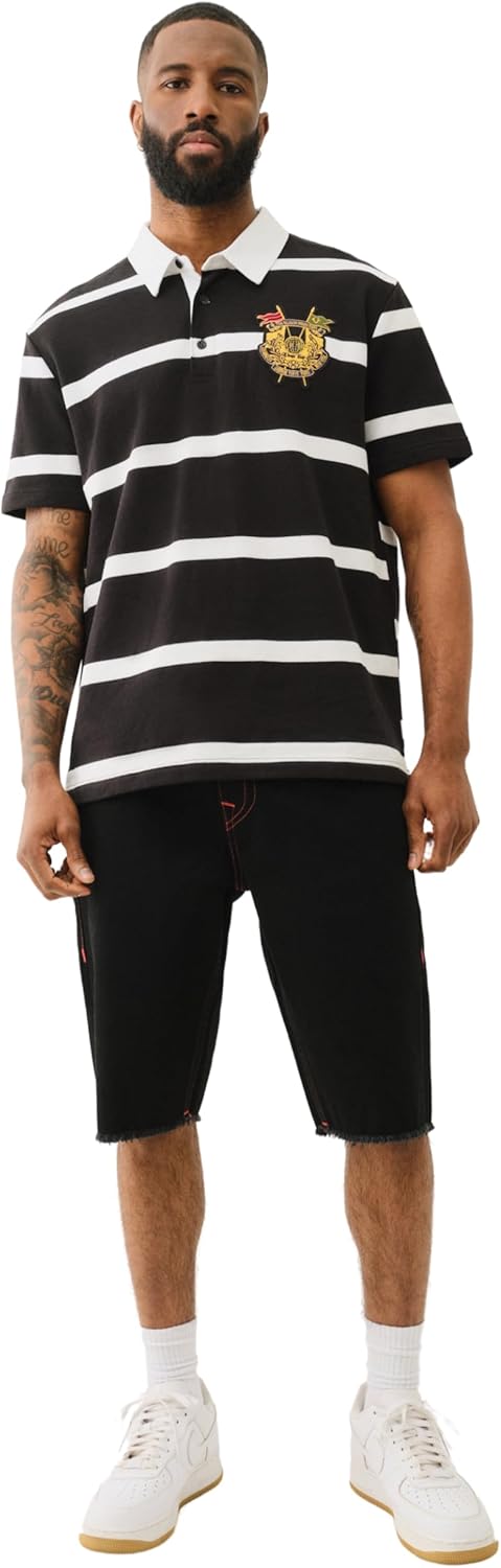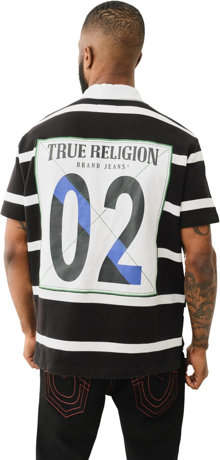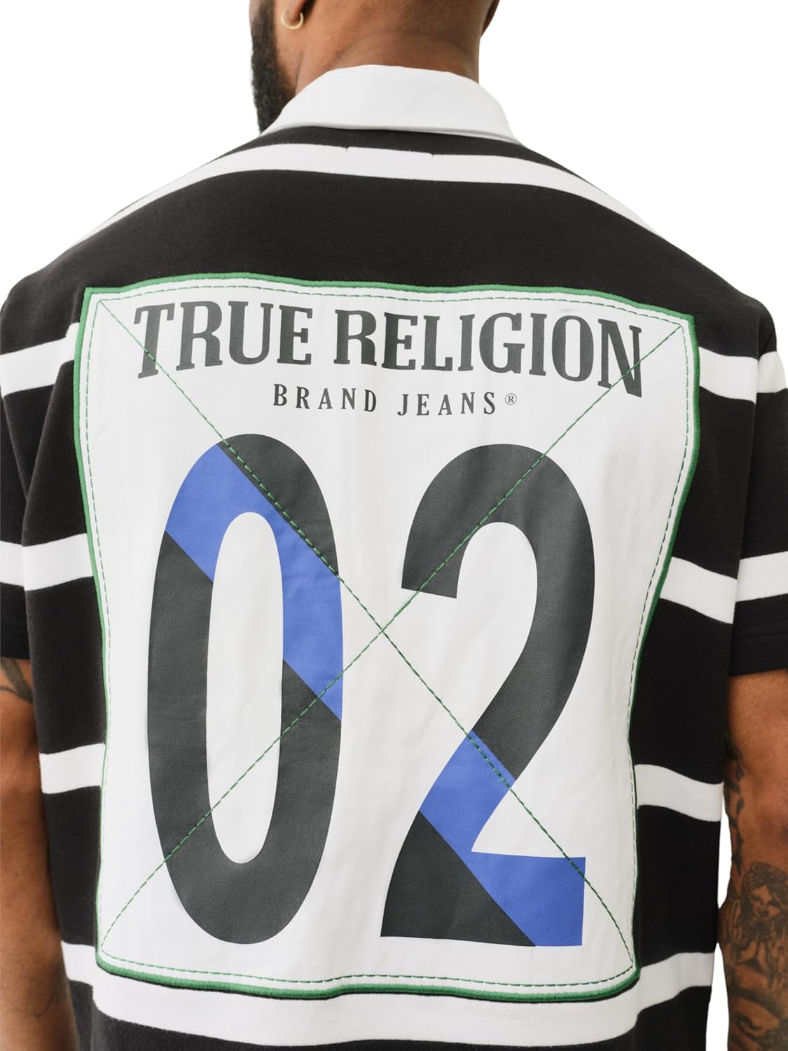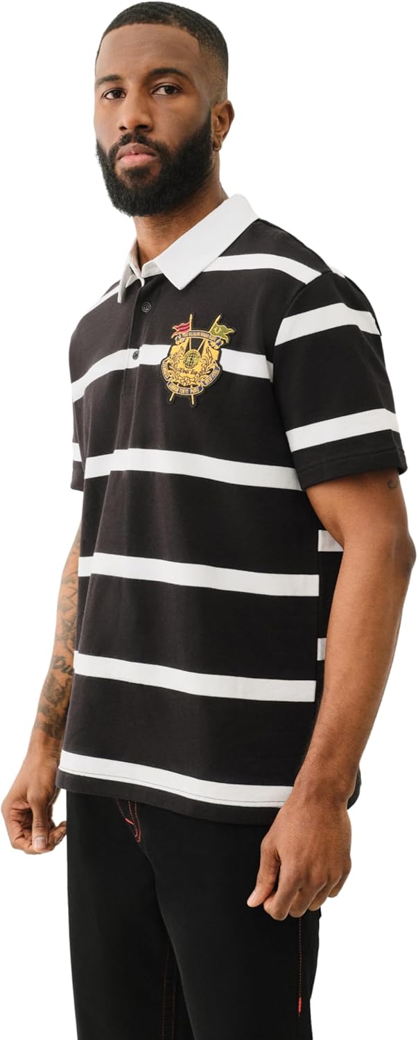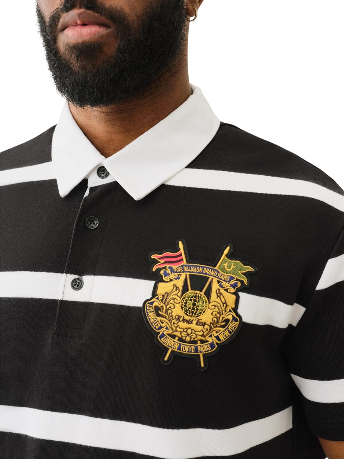 True Religion Men's SS Boxy Stiped Crest Polo - Jet Black/Optic White | Short Sleeve Polo Shirt