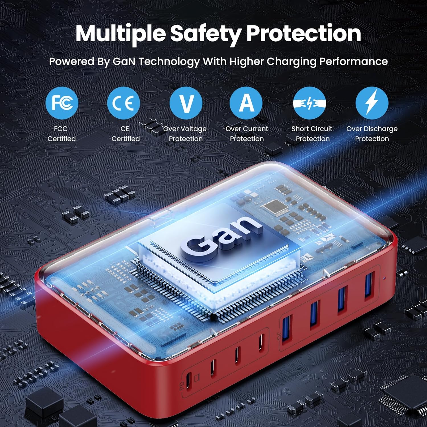 【Latest GAN III Chip Technology Charger Station】The USB C charger adapted GaN III generation chip technology, built-in multi-protection system and premium microchips. With higher energy efficiency, higher resistance to radiation and upgraded heat dissipation, Gallium Nitride (GaN) makes our chargers smaller and safer without sacrificing a drop of power. Trustworthy Charging Station with 3 Years Warranty!