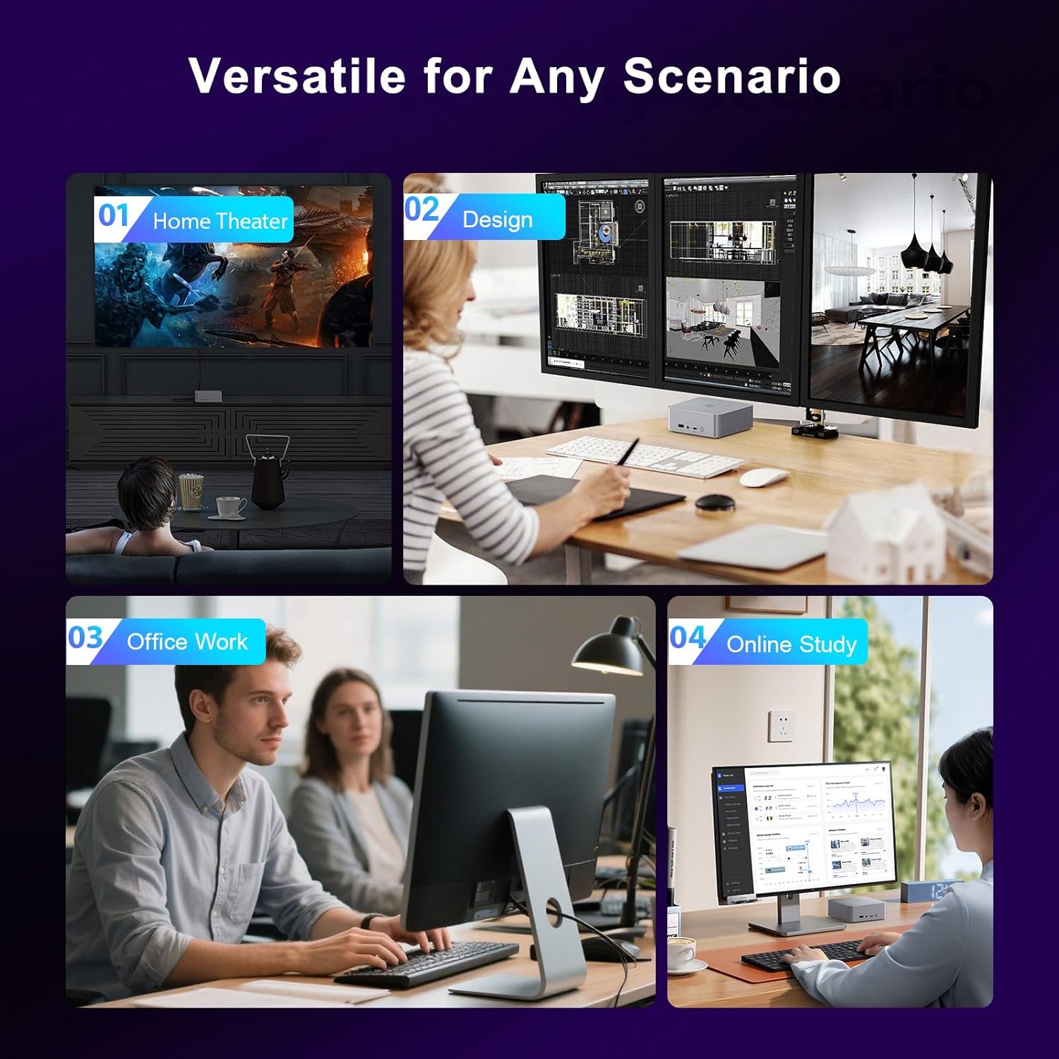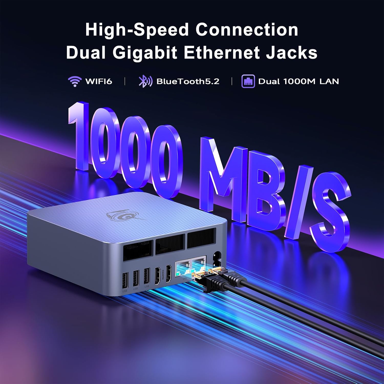Reliable & High-speed Connectivity: 12th Gen Intel mini pc features dual 1000M LAN ports, WiFi 6 and Bluetooth 5.2. WiFi 6 is up to 2.4 Gbps transmission speed, three times faster than WiFi5. Lower latency Bluetooth 5.2 offers more stable and efficient connections to multiple wireless devices such as projector, printer, speakers and etc. The dual nic mini pc is perfect for video conference, browsing, streaming, large file transfers, and online collaboration