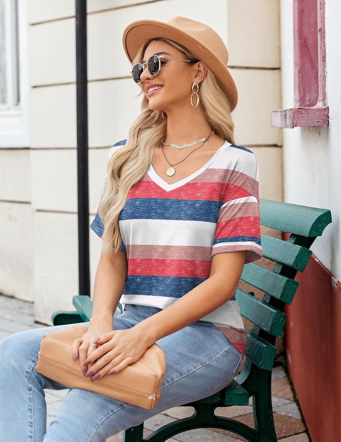 FEATURES: V Neck tees, short sleeve t-shirts, roll sleeve, basic cute tees tops, plain, striped, floral printed, trendy loose fit shirts. It effortlessly complements any body type and can be easily styled with various fashion pieces. Tips:some of the striped colors are non-positioned, the collar's colors are random.
