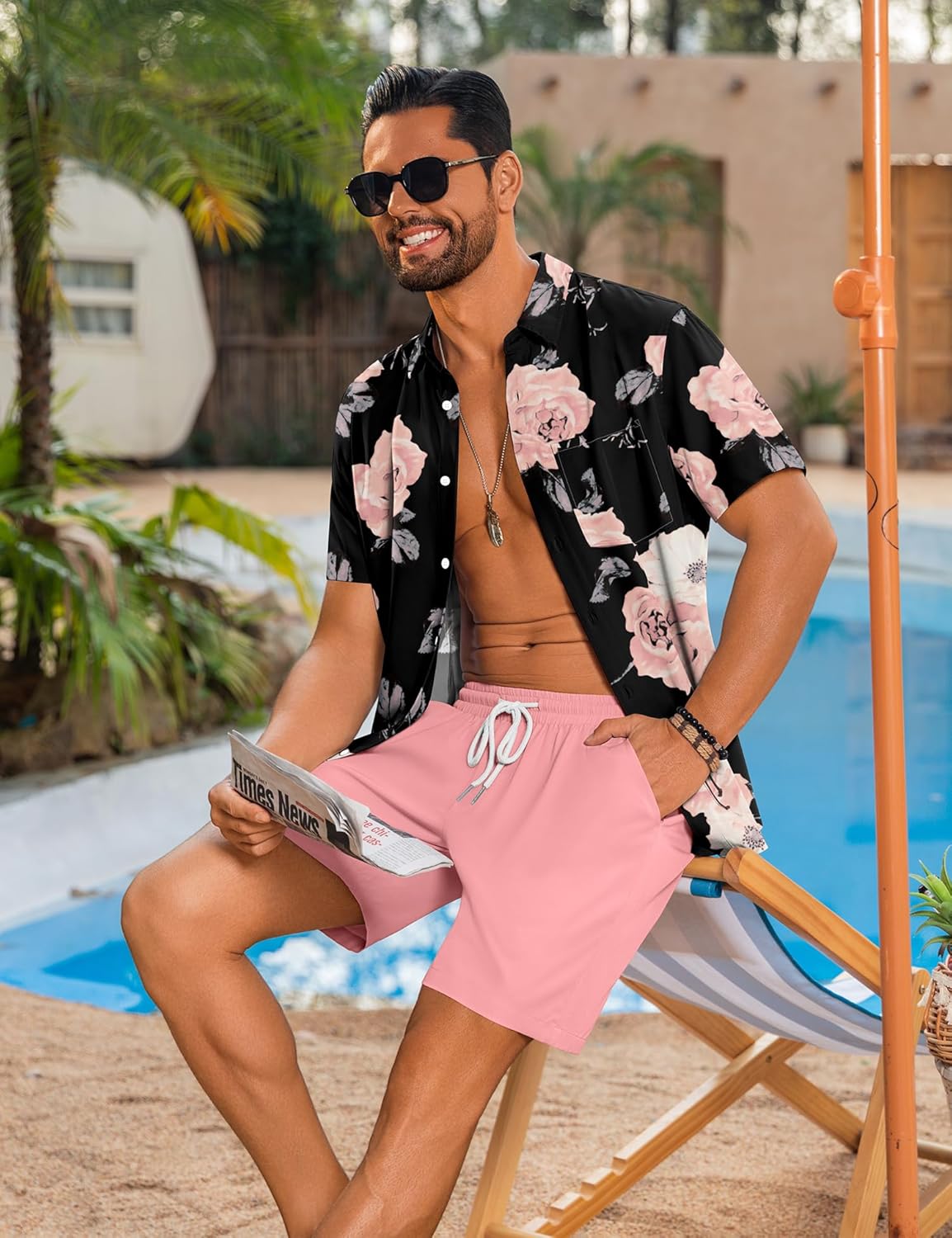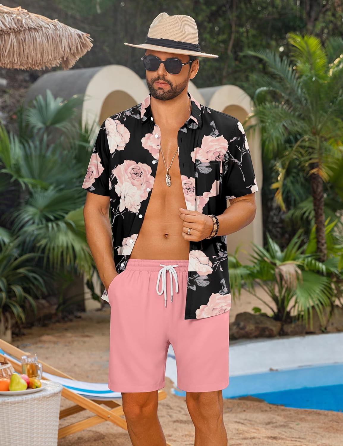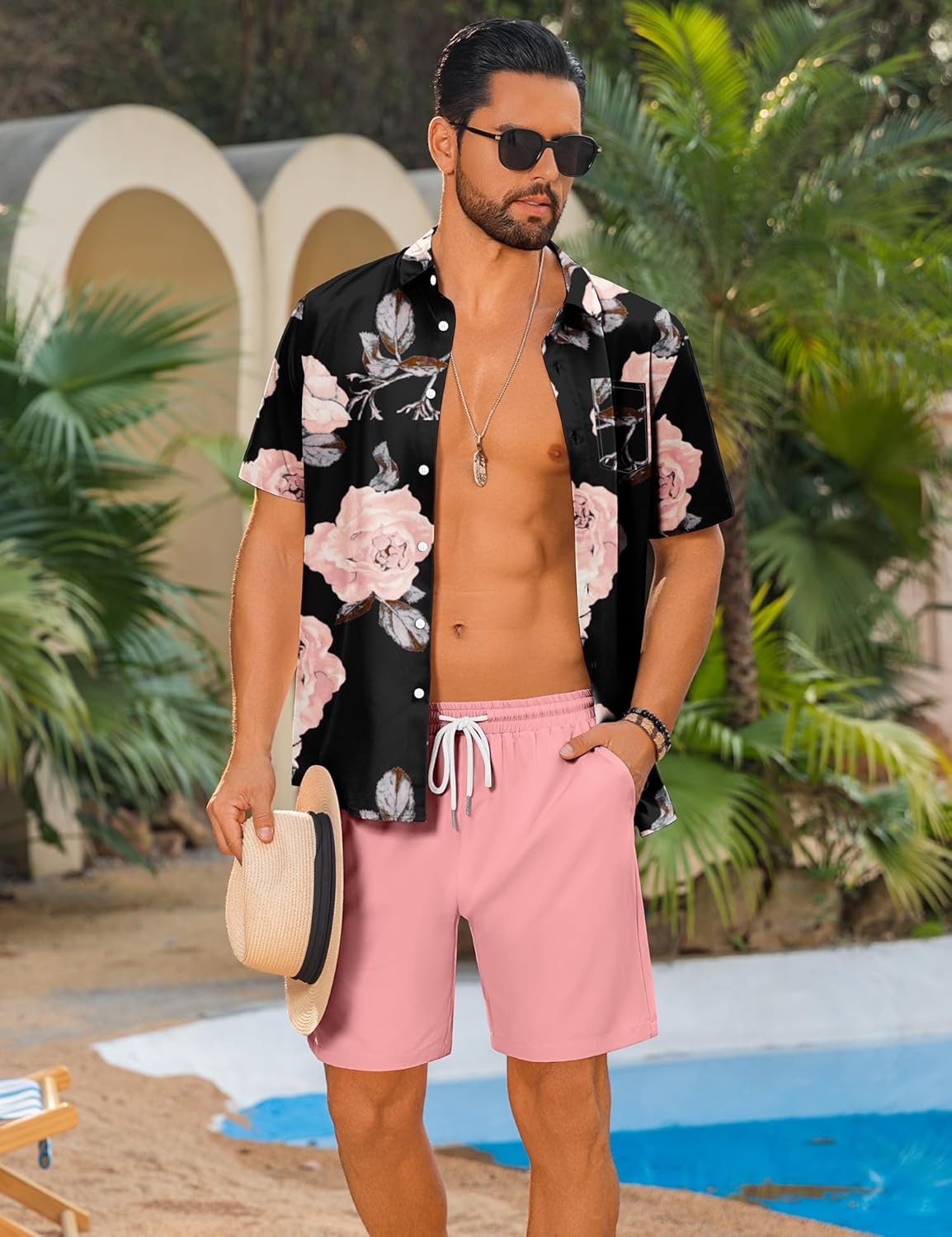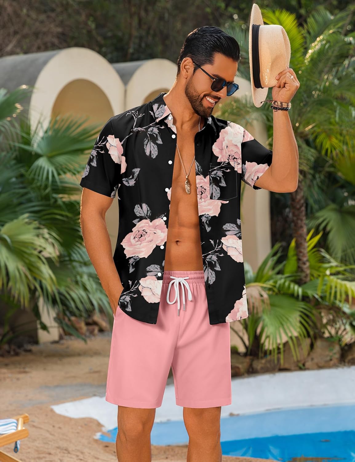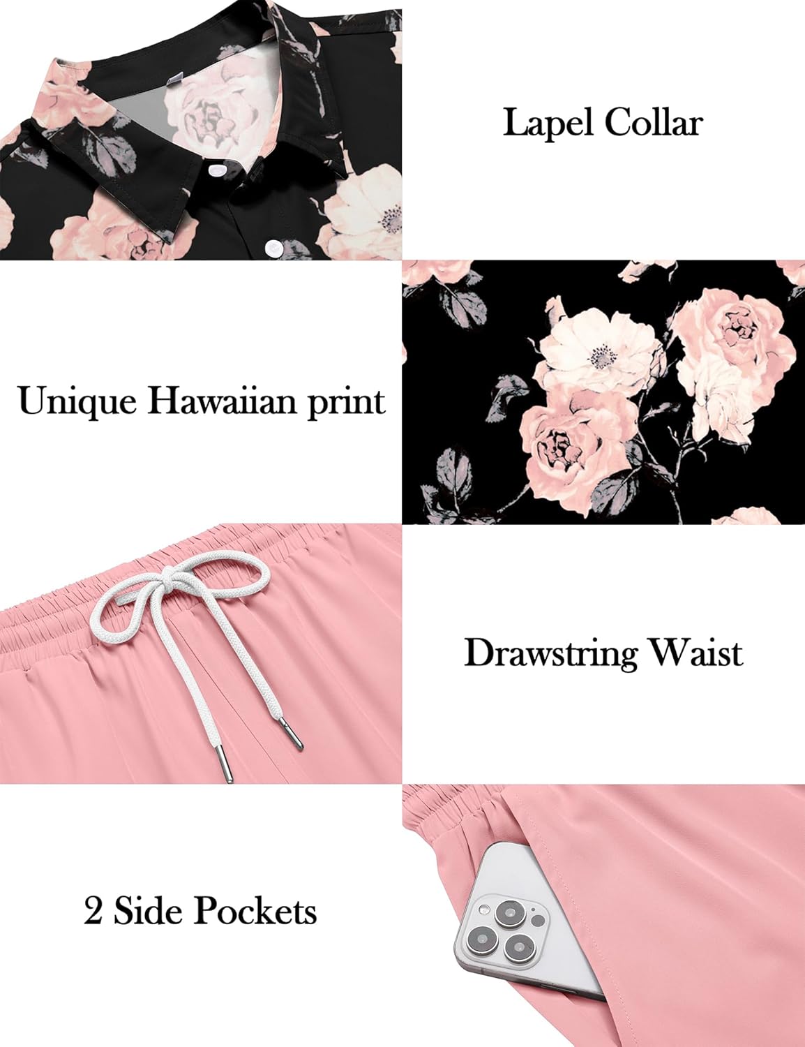 Mens Aloha Hawaiian Shirts Set: Aloha tropical shirt with floral print, short sleeve, lapel collar, button down and chest pocket, solid color shorts with a drawstring waist and two side pockets for convenient storage of personal items. The mens hawaiian cheerful color outfit delivers an instant summer vibe